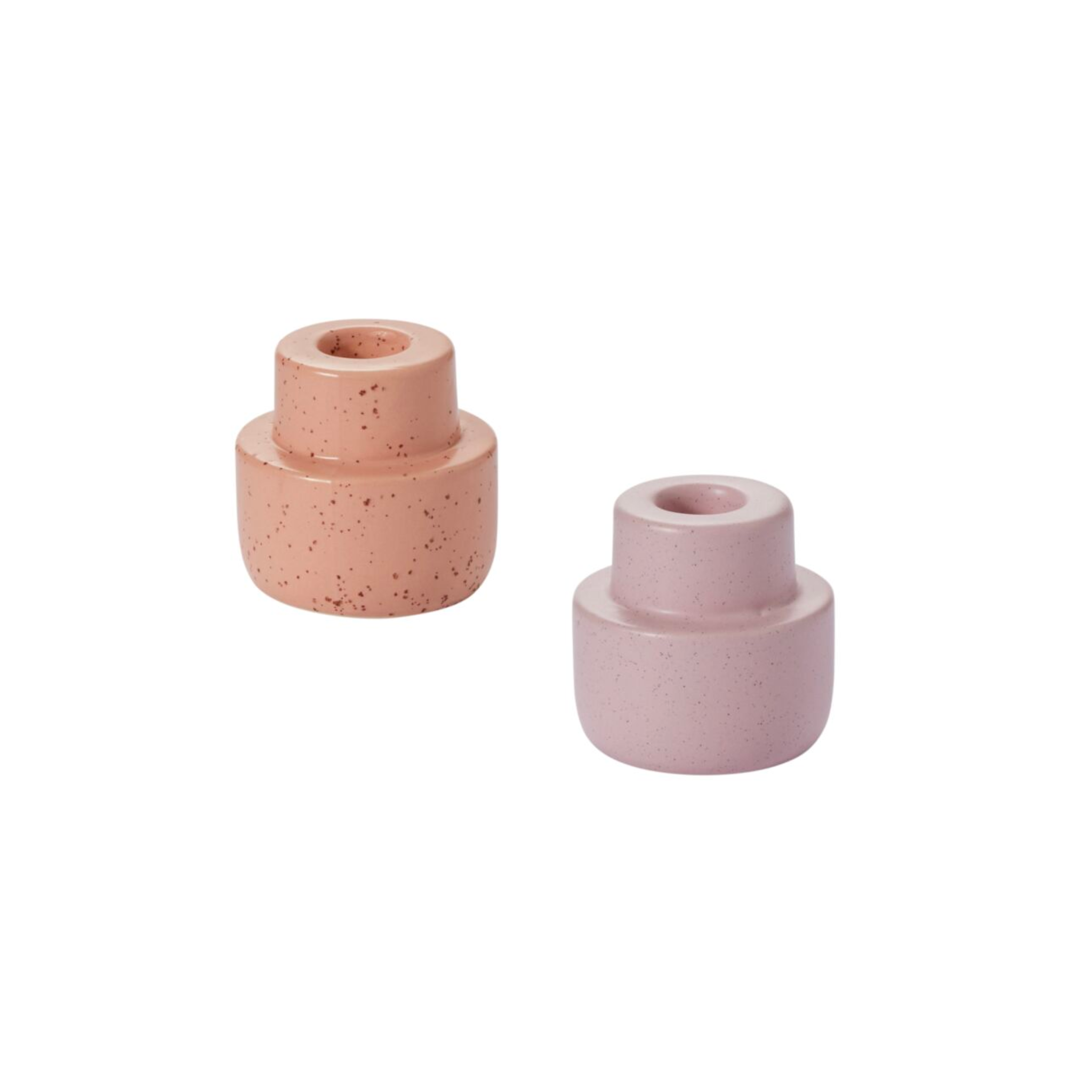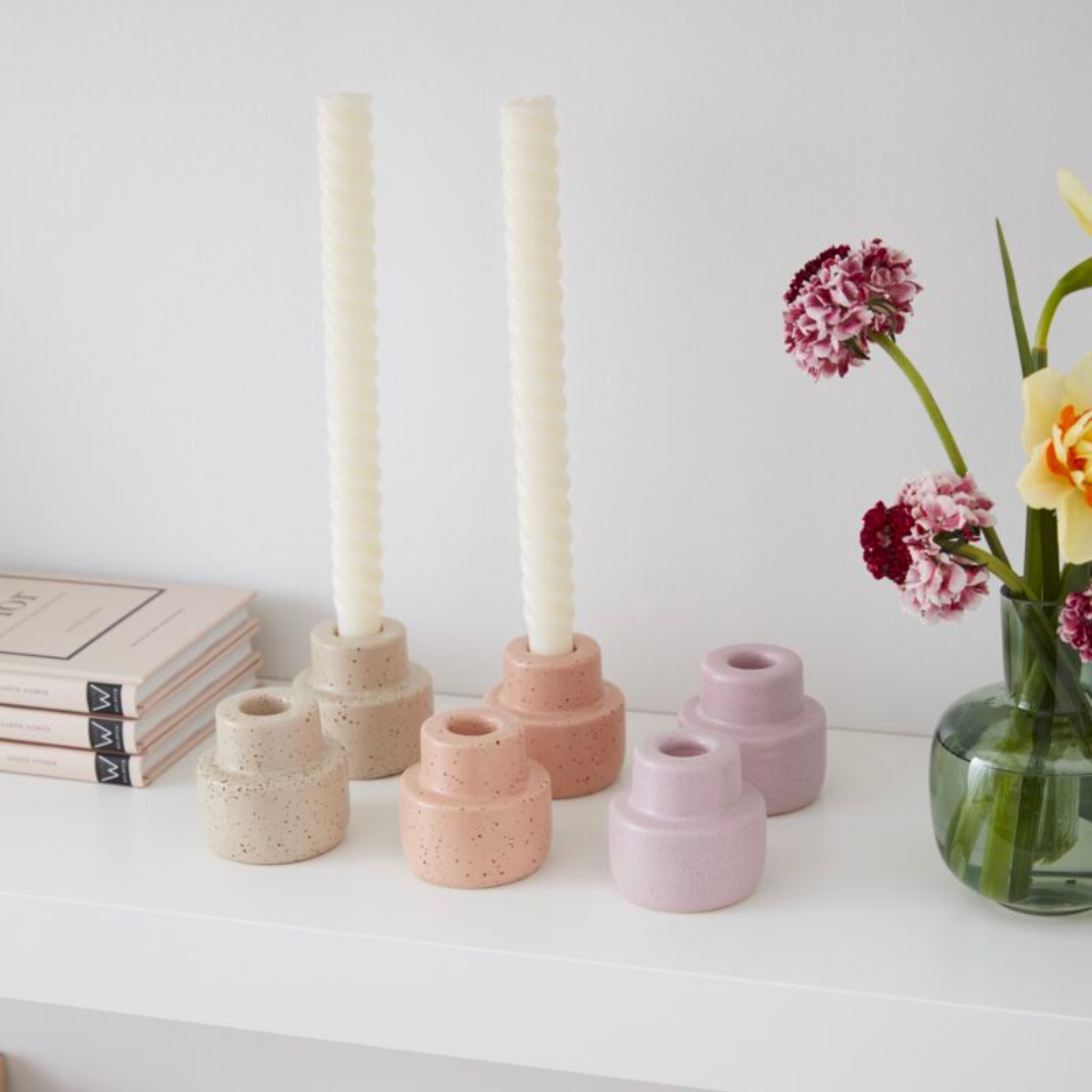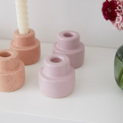 Bring modern, playful style to event centerpieces or home decor with this low profile ceramic candleholder. It holds a standard size taper candle & fits under a 2.5-inch glass sleeve. Featuring fresh, muted color & a subtle, smooth speckled finish for visual interest, this piece makes a fun & contemporary addition to wedding & event design or home & gift retail.