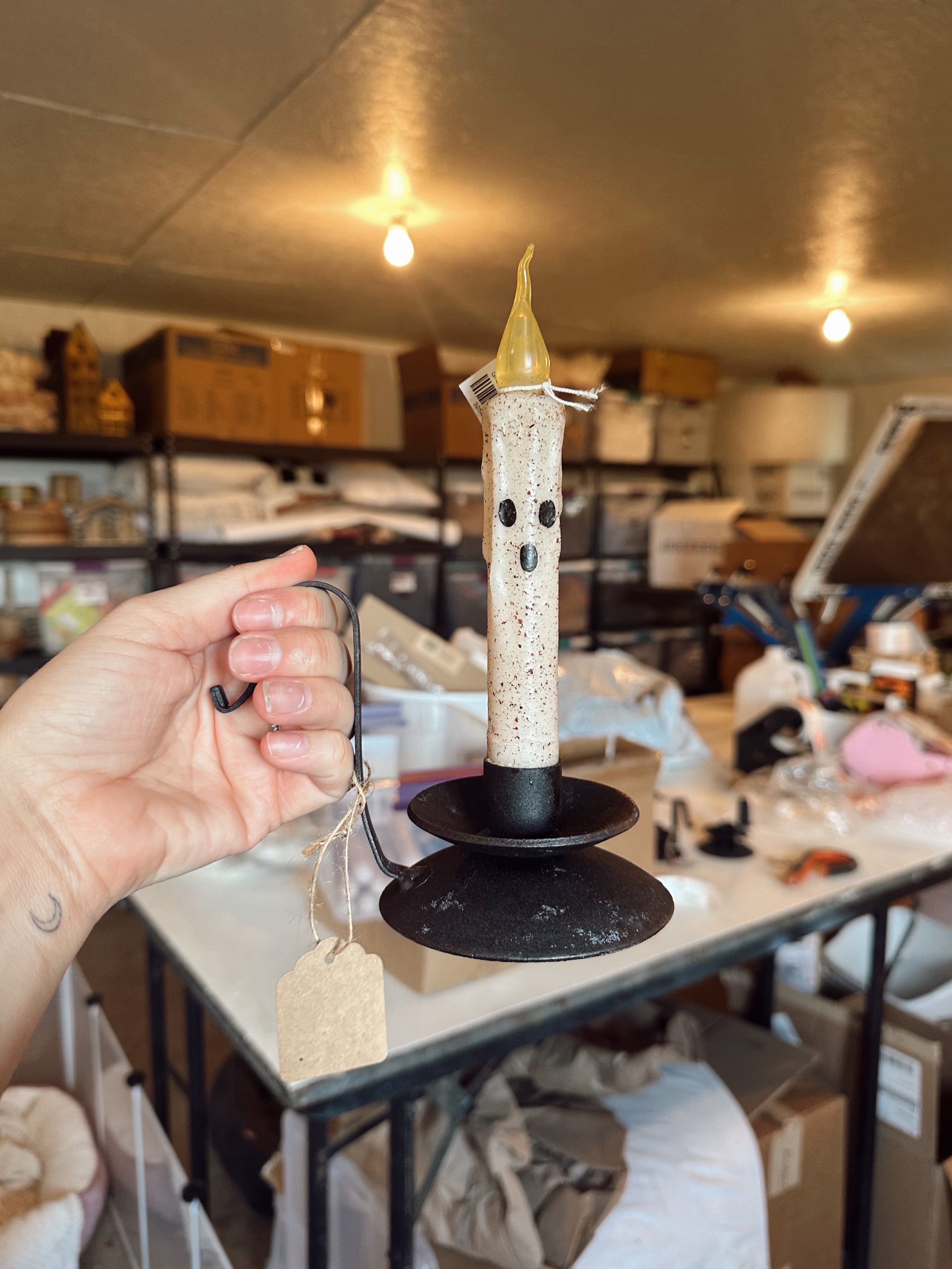 Our Ghost Timer Taper is a 6" battery-operated taper candle with a grungy, textured wax coating and a simple ghost face design that's perfect for spooky Halloween decorating. Its flame-shaped tip casts a soft, flickering glow. Requires 2 AAA Batteries (not included).