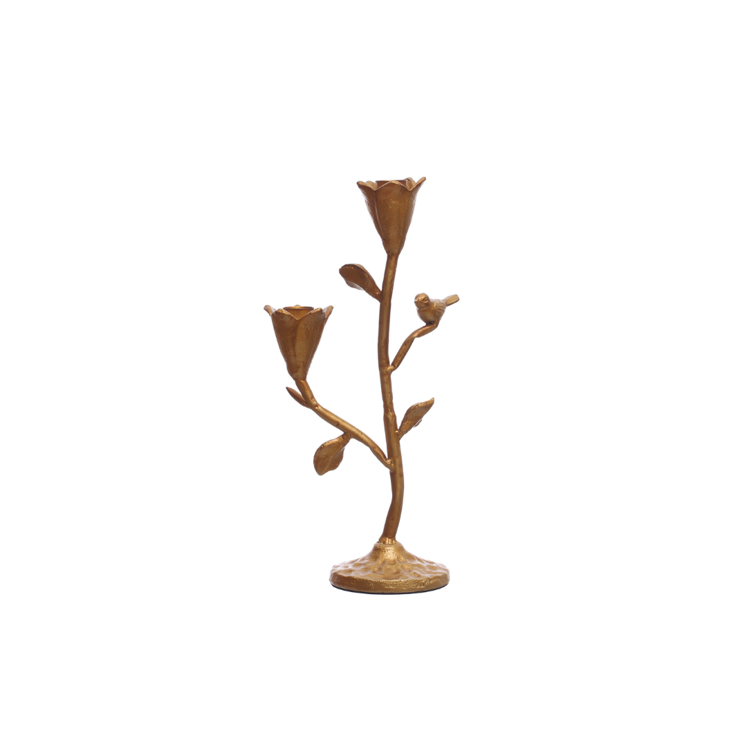 Sturdily constructed from hand-forged cast iron, our Gold Finish Flowers and Bird Candelabra has a design that gives it a nature-inspired vibe. This candle holder has a spot for two taper candles and a gold finish that adds a lovely designer touch. Light up your space and bring beauty to any tabletop with this 2-candle holder.