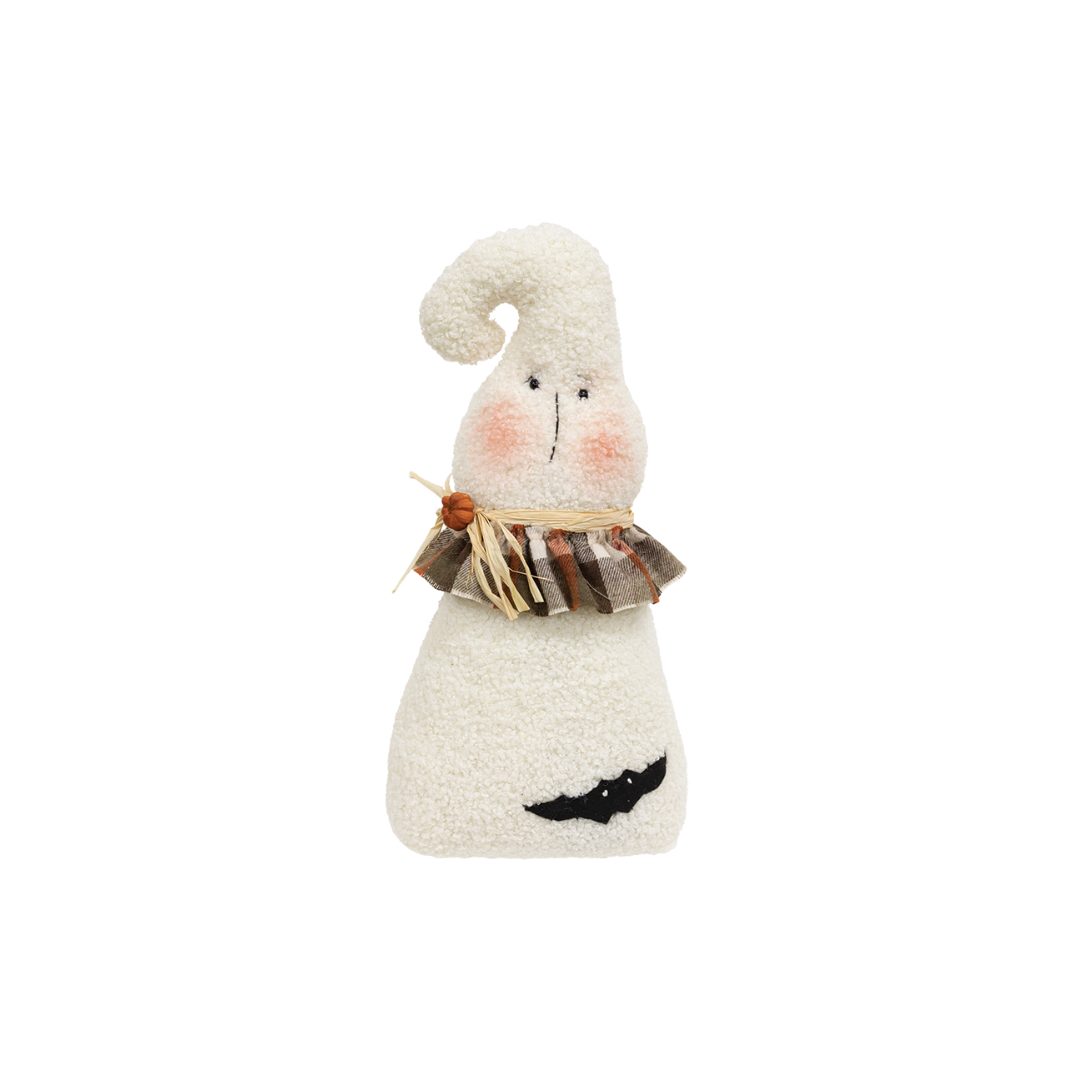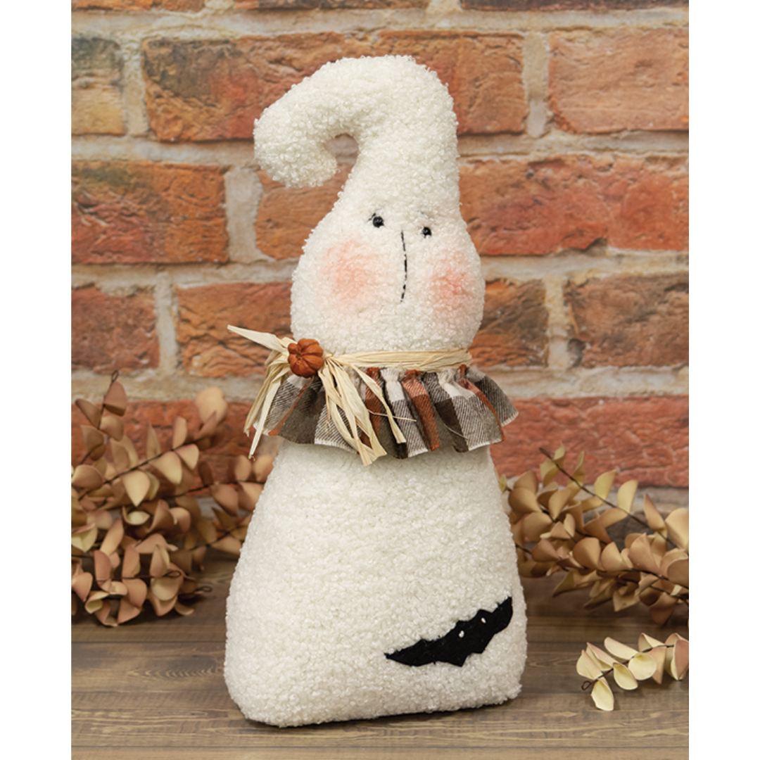 This whimsical ghost doll wears a ruffled, plaid collar accented with raffia and a tiny pumpkin. There is a bat friend attached to the textured fabric of this rosy-cheeked primitive ghost. The bottom is weighted for freestanding display.