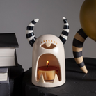 The playfully fearsome scowl of the little monster tealight holder is open wide and ready for a candle. This ceramic monster has one centered eye and striped horns atop his head.