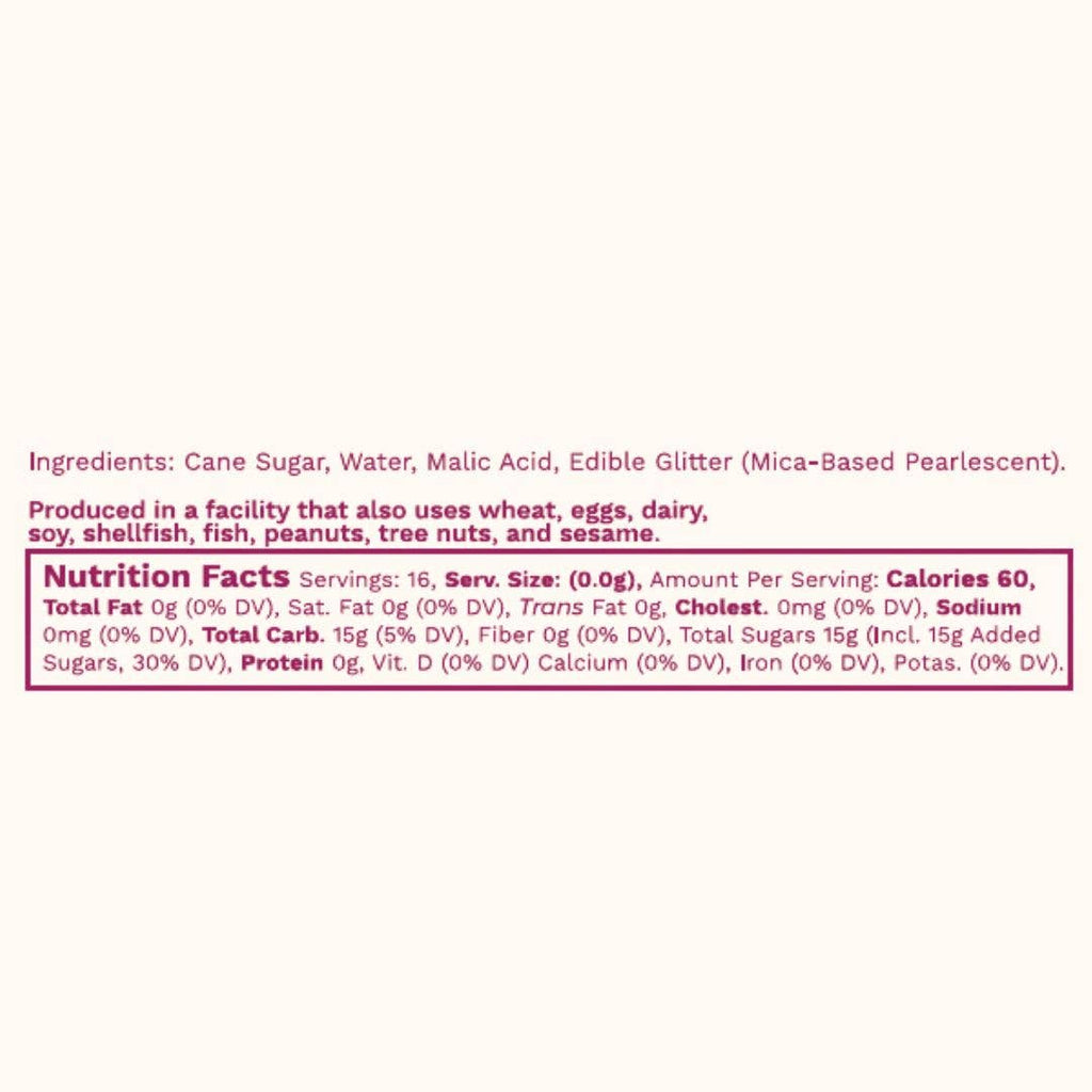 Ingredients: Cane sugar, water, edible glitter (mica), malic acid.