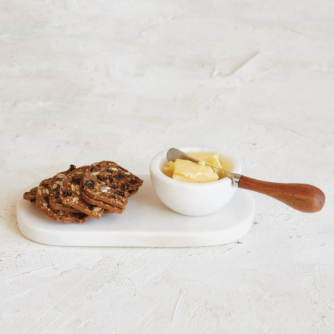 A sophisticated and elegant way to serve cheese and other snacks, featuring a white marble board, a matching bowl, and a mango wood canape knife. Made of high-quality marble and mango wood, sustainable and eco-friendly materials.
