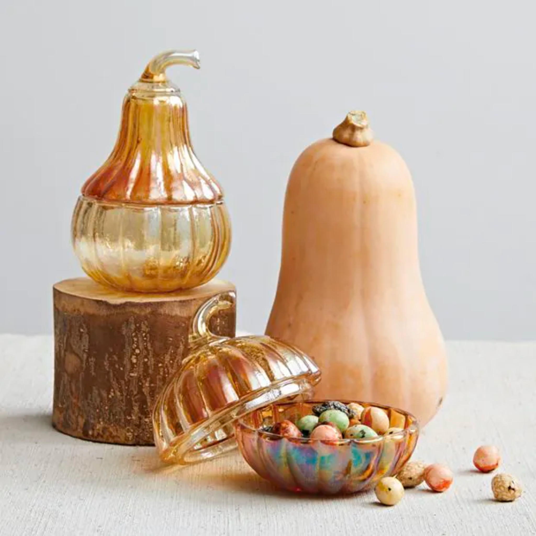 Glass pumpkin-shaped & gourd-shapped lidded jar that can each be used to provide a chic and decorative storage solution for small items or for displaying colorful candies or sweet treats. Amp up your seasonal tabletop decor with this beautiful set of glass jars.