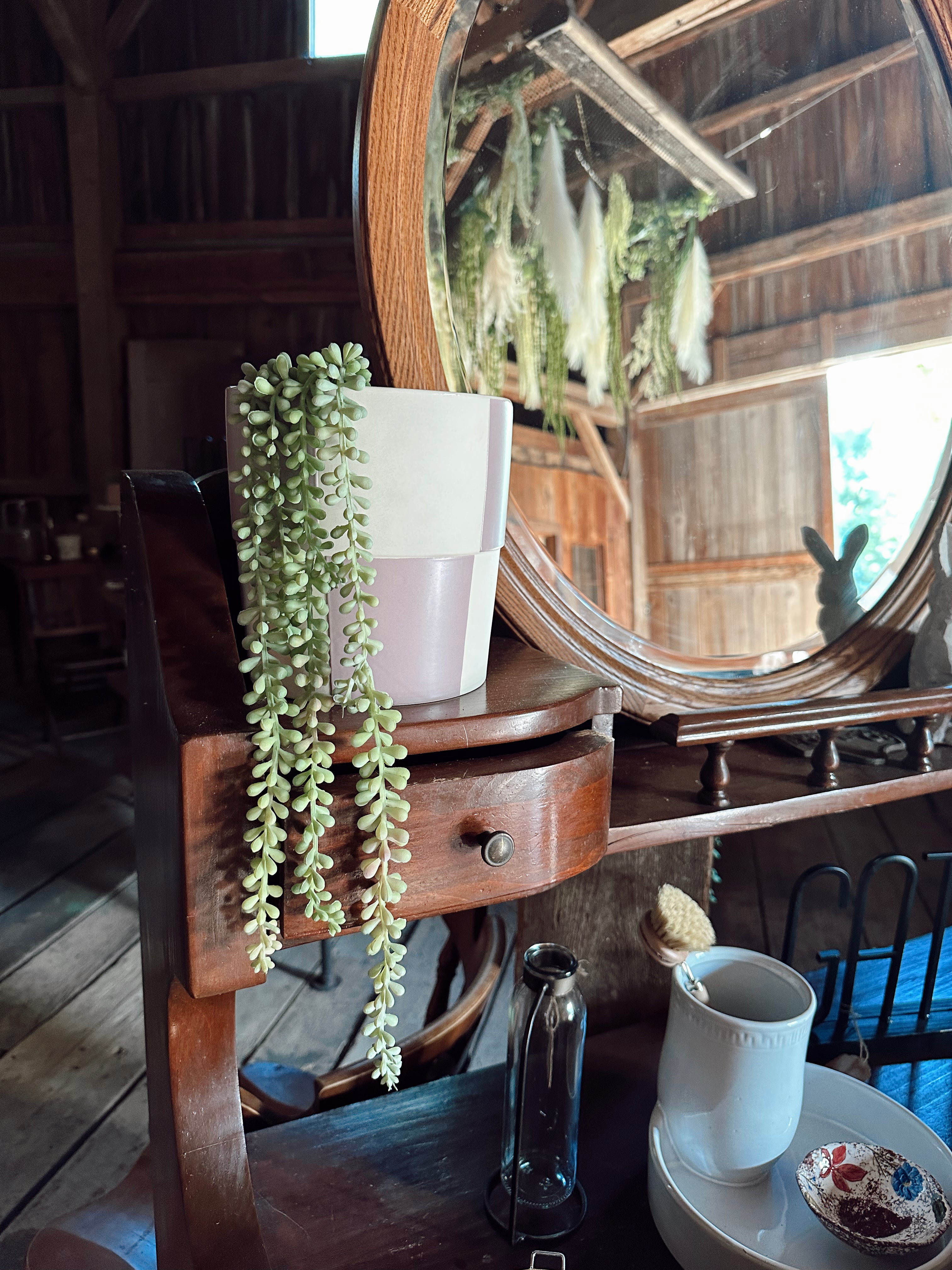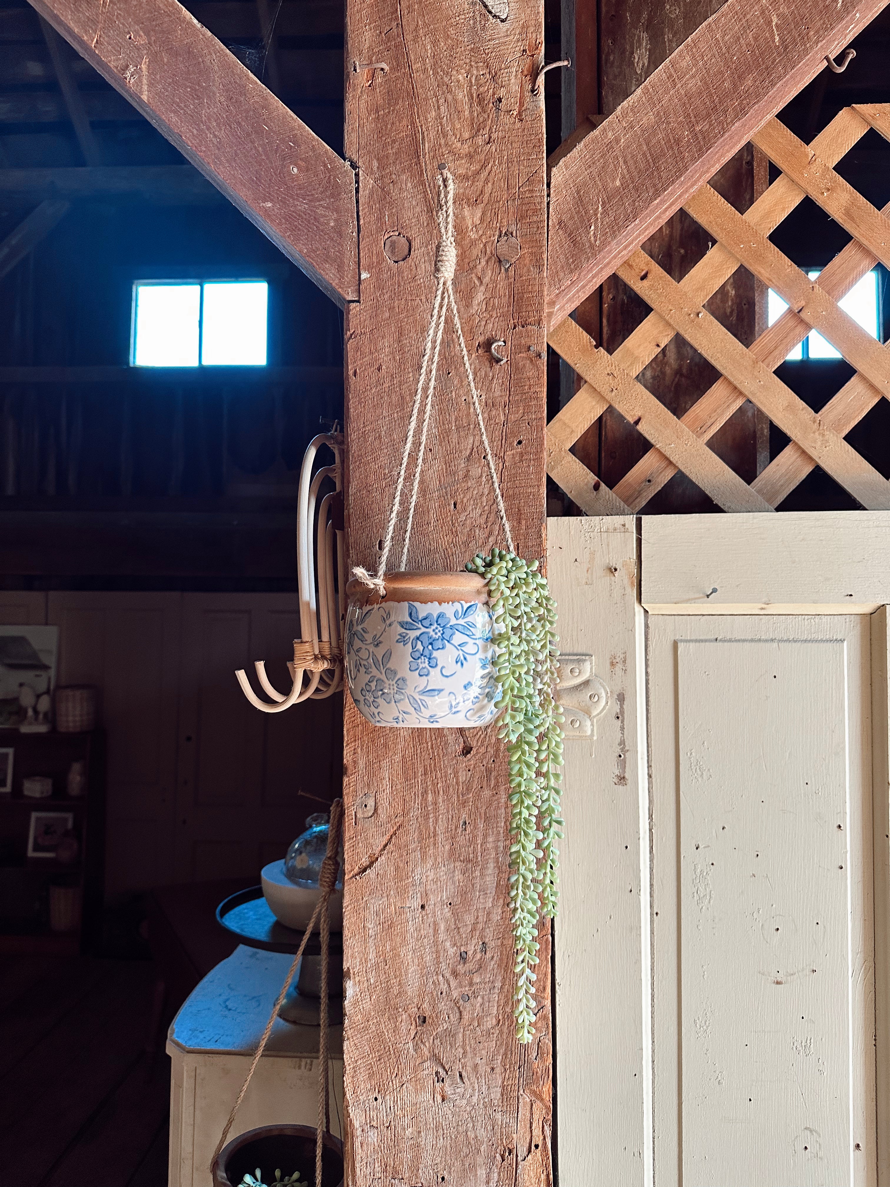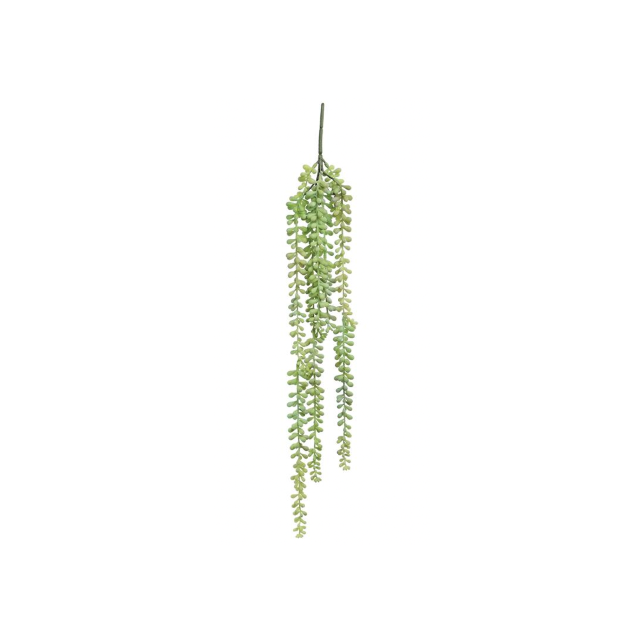 Bring a touch of nature inside with our faux, natural feeling jelly bean succulent. This whimsical succulent in a vase, planter, or hanging down from a mantle or cabinet.