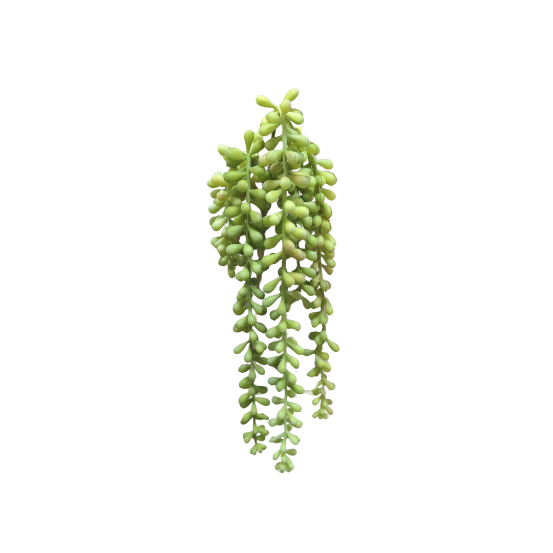 Bring a touch of nature inside with our faux, natural feeling jelly bean succulent. This whimsical succulent in a vase, planter, or hanging down from a mantle or cabinet.