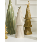A charmingly artful ceramic tree that features a stacked design, each layer detailed with vertical ridging. Topped with a small bird icon, this hand-painted tree is a beautiful shade of warm white, with hints of natural bisque that peek out at the edges.