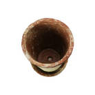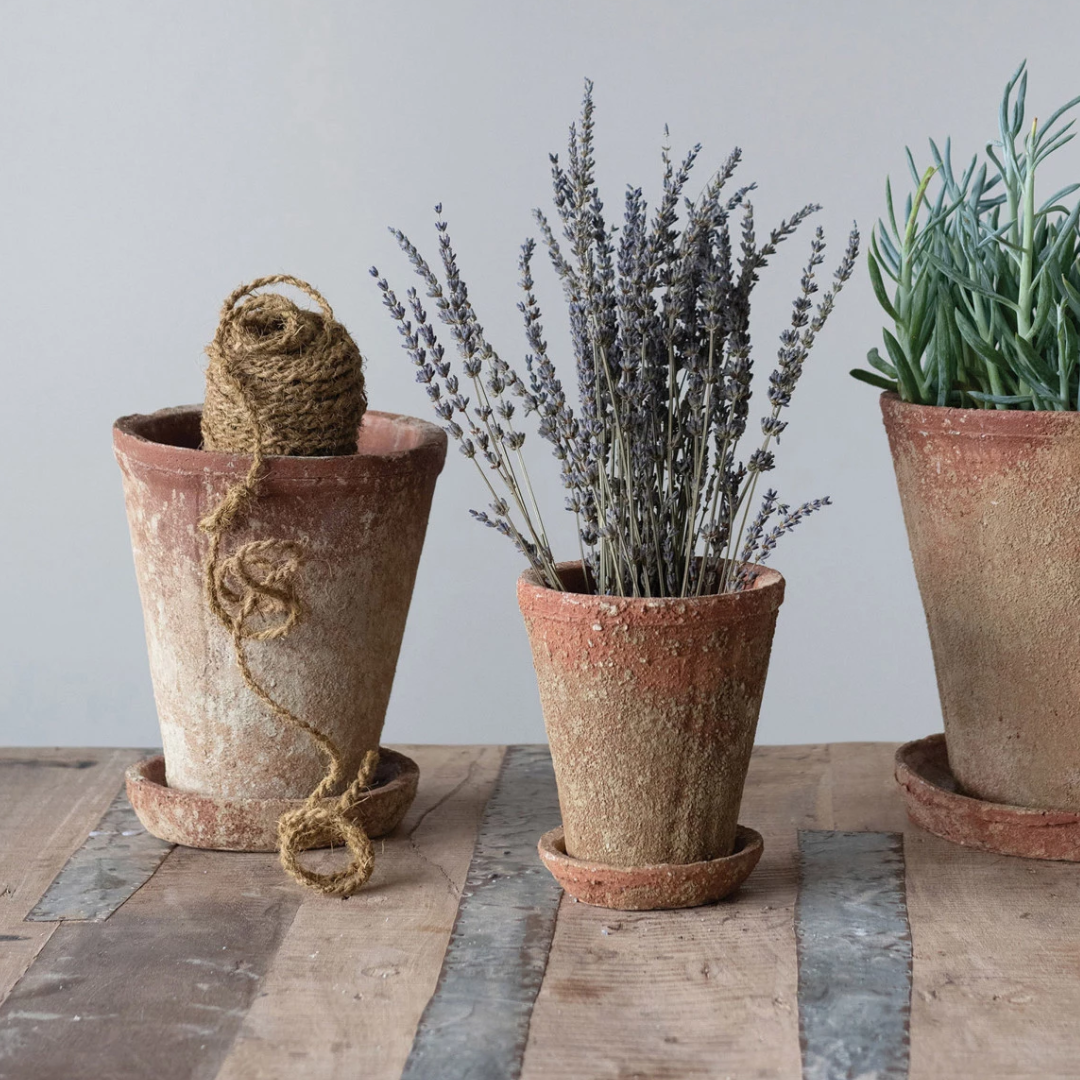 This terracotta cement planter with a saucer and distressed finish can add some rustic and natural charm to any space. It has a saucer and a drainage hole that prevents overwatering and keeps the plants healthy.