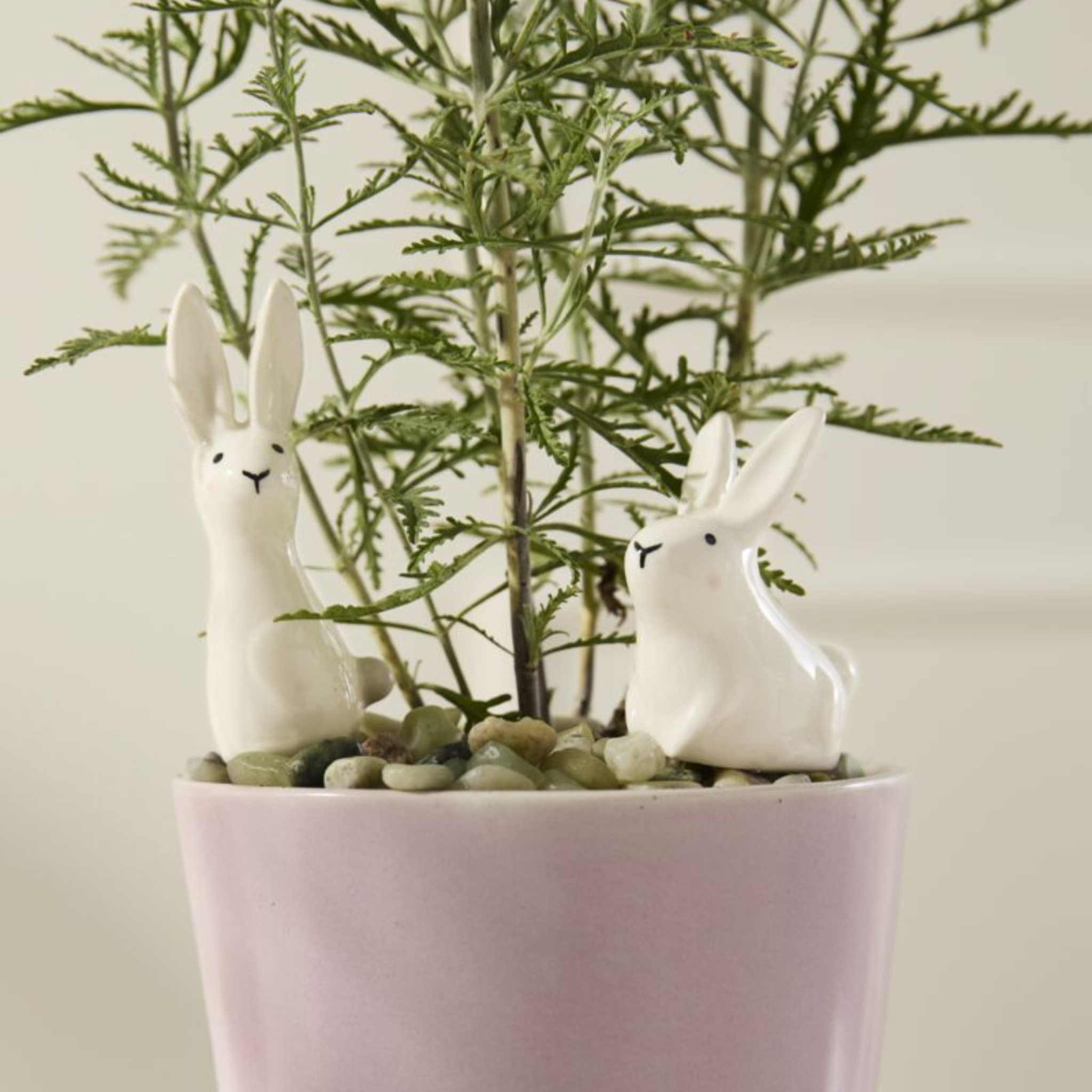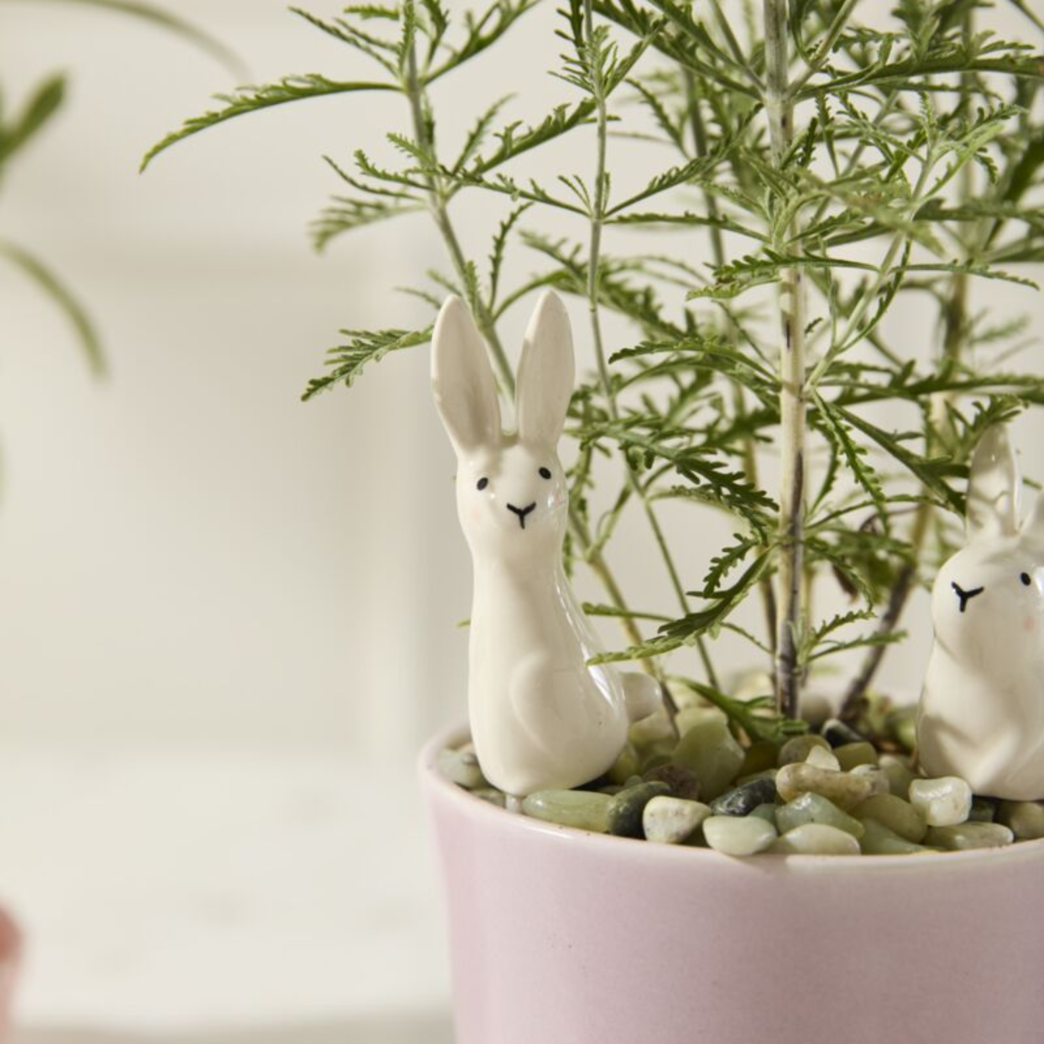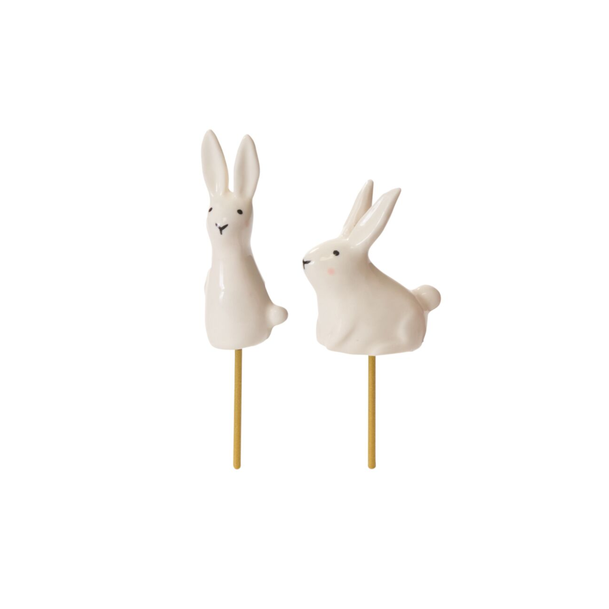 Garden friends make the world sweeter & these rabbits aren't even a nuisance to growing things! Meet the Thumper Plant Sticks, a white ceramic set of 2 bunnies that happily sit inside potted plants, such as our Veggie Pots. Featuring hand painted face details, a glossy finish, & 2 different bunny styles on gold metal sticks, these plant accessories make a playful Easter or springtime accent for any plant.