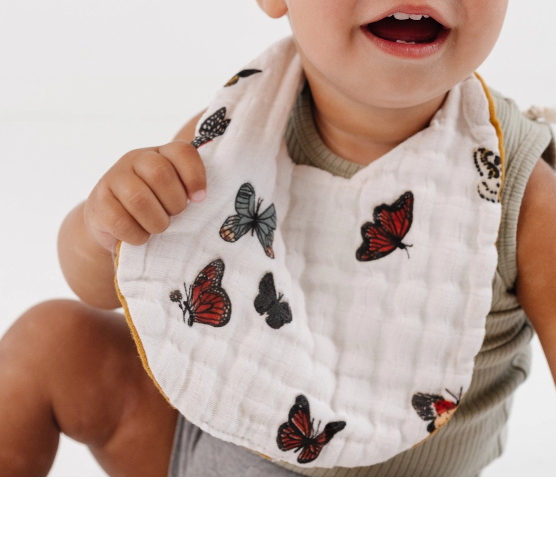 Butterfly in the skyyyy, I can go twice as high. Take a look, our Butterfly Bib has our hearts all a flutter. Perfect for first foods, teething, spit up, whatever you need. Double layered absorbent muslin