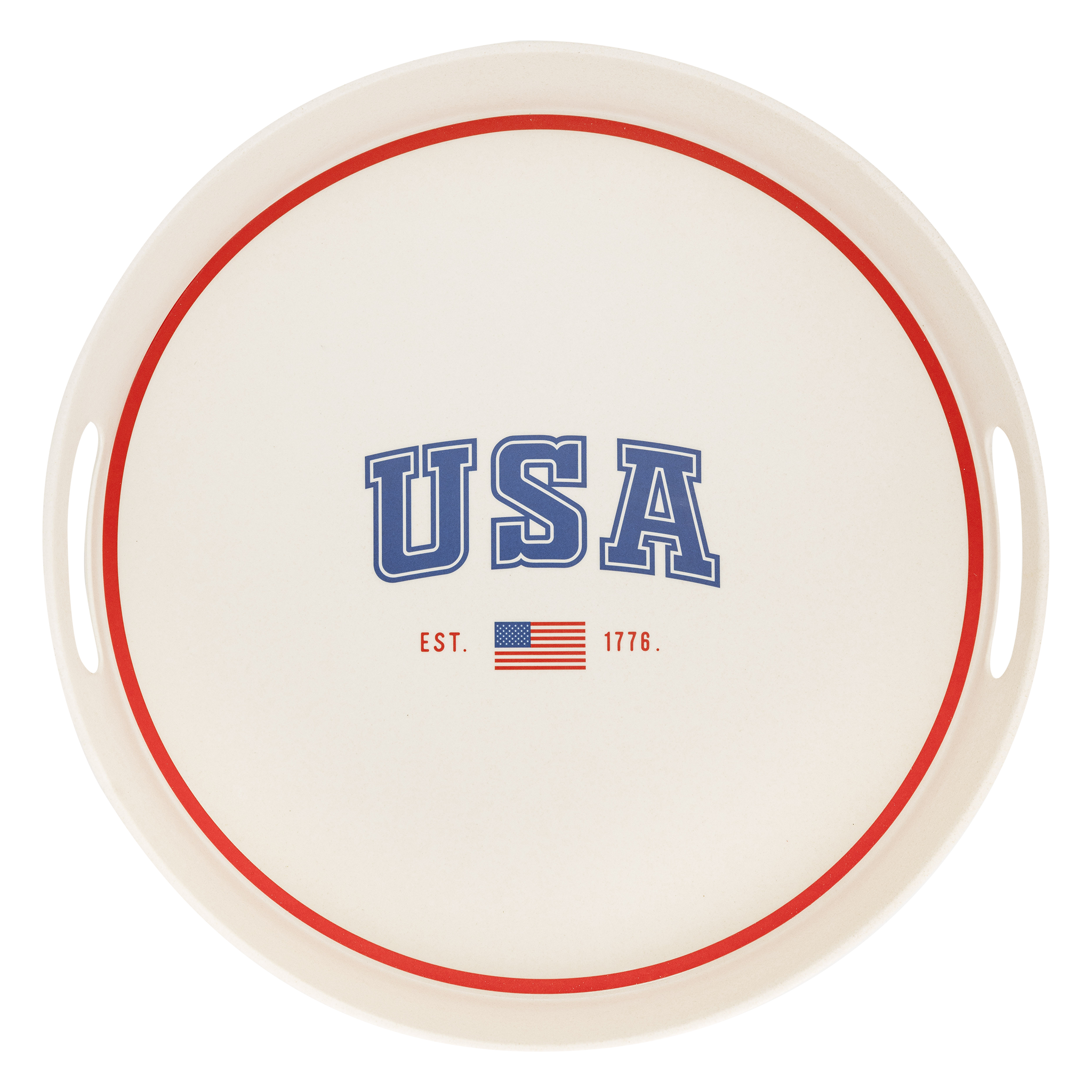 Serve up some fun with our USA Round Reusable Bamboo Serving Tray. Made from sustainable bamboo, this tray is perfect for all your party needs. Show off your patriotic spirit while also being environmentally friendly. Cheers to that!