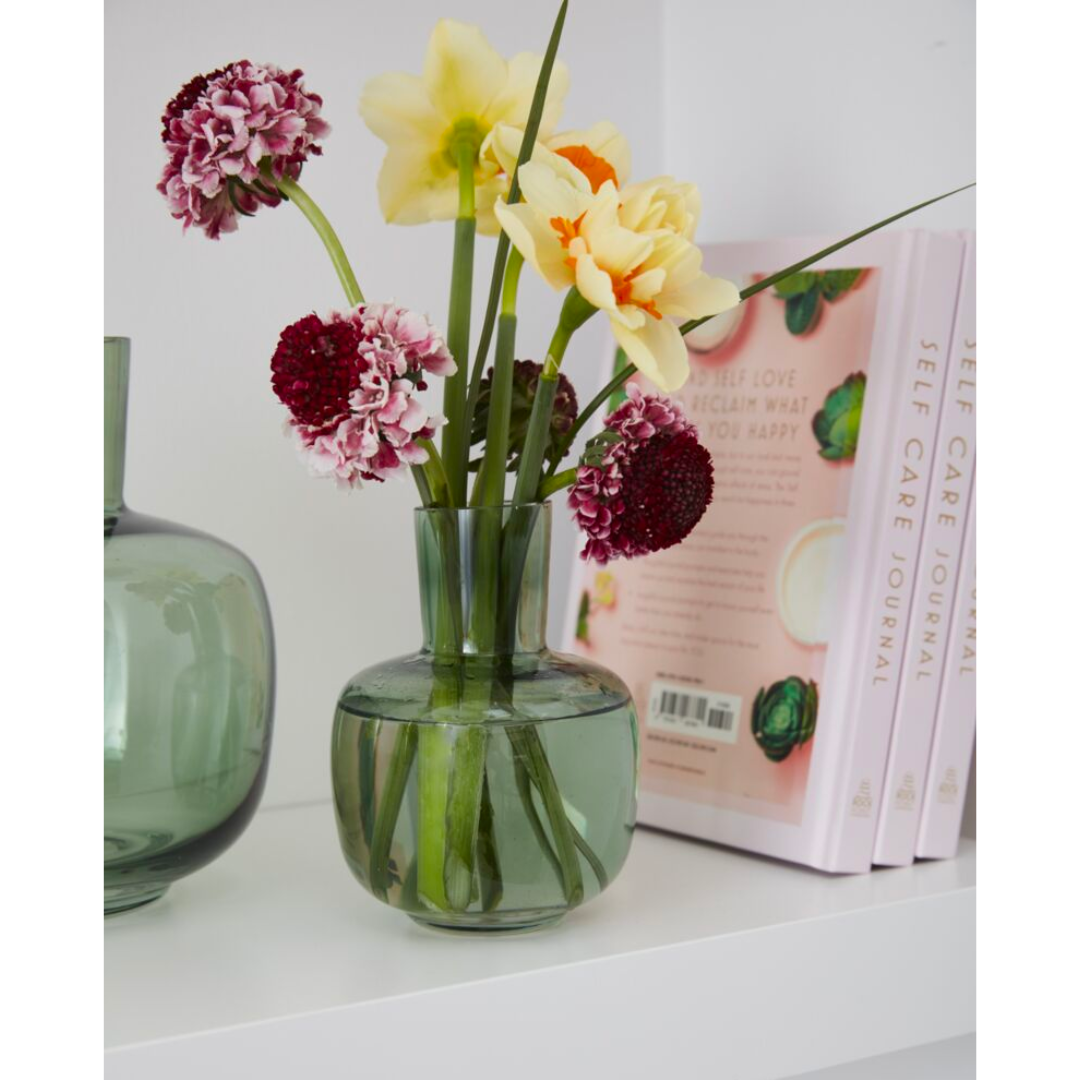 Create a vintage-inspired arrangement like no other with the short Melrose base. Featuring a wide base & slight flare on a slim neck, this green colored glass vase offers a clean silhouette. It also makes a great home for propagation clippings. We recommend hand washing or wiping clean to keep the color fresh & beautiful.