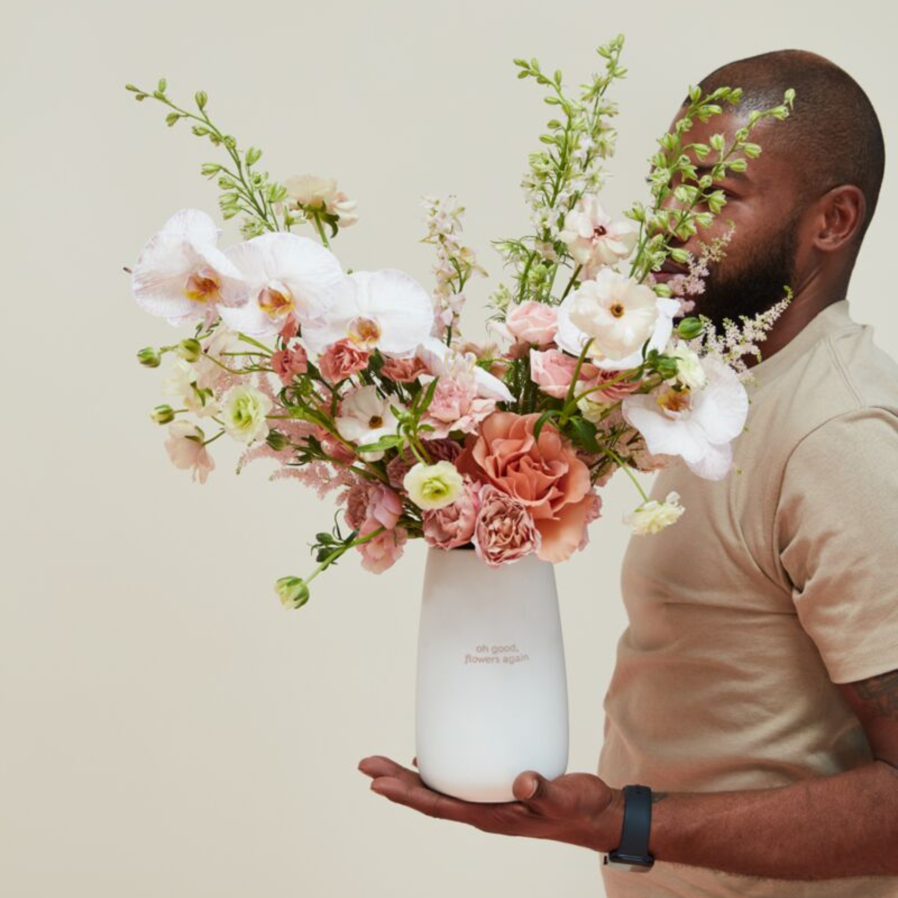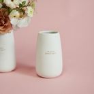 Nothing says love like a little irony alongside a bouquet of flowers. What better expression of it than a vase with cheeky verbiage stamped on the outside? The simple, classic cylinder vase is glazed in white with the phrase "oh good, flowers again" glazed in pink.