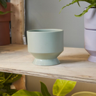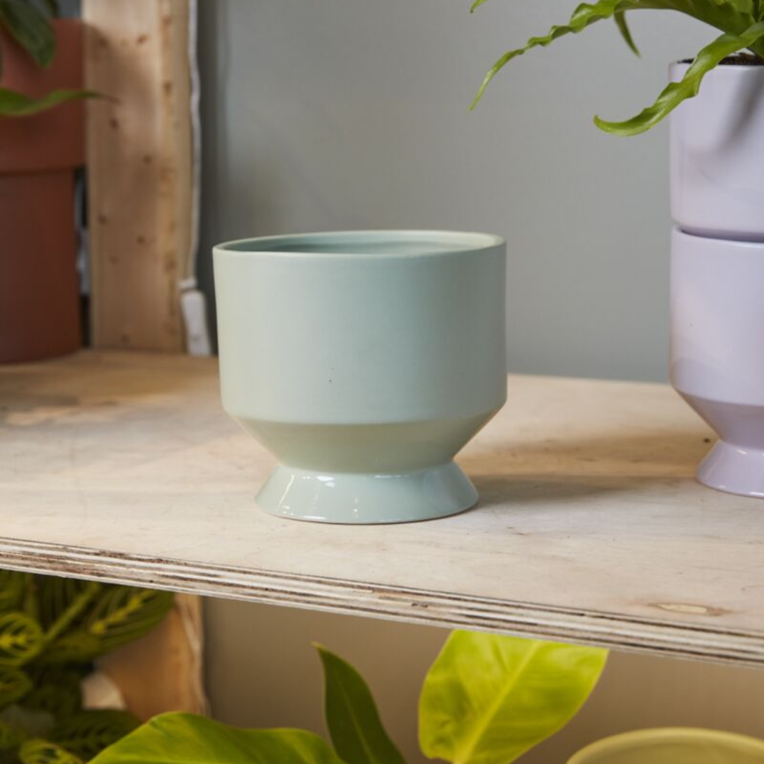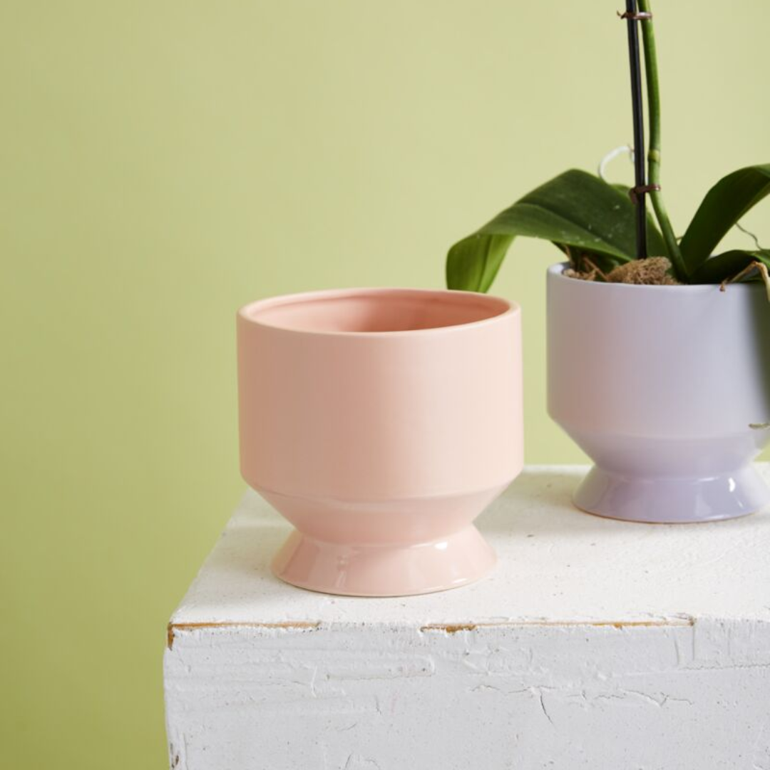 Freshen up your space with the chic, soft vibrance of the peach or sage Pasadena Pot. This cylinder-shaped, footed indoor plant pot has a smooth matte body & shiny glazed foot.