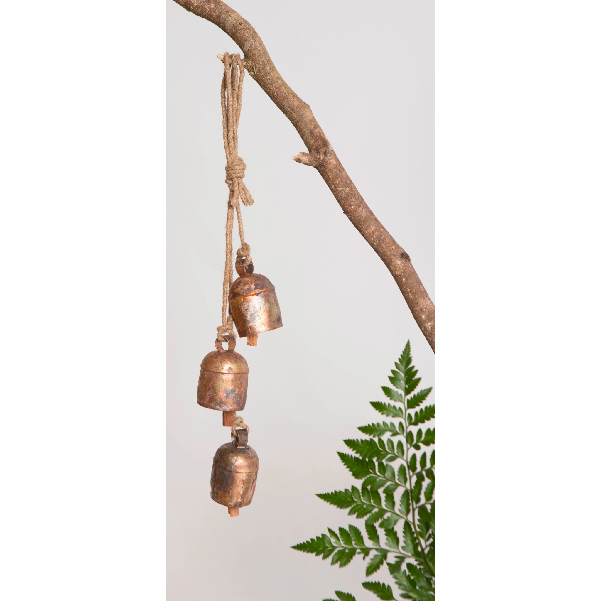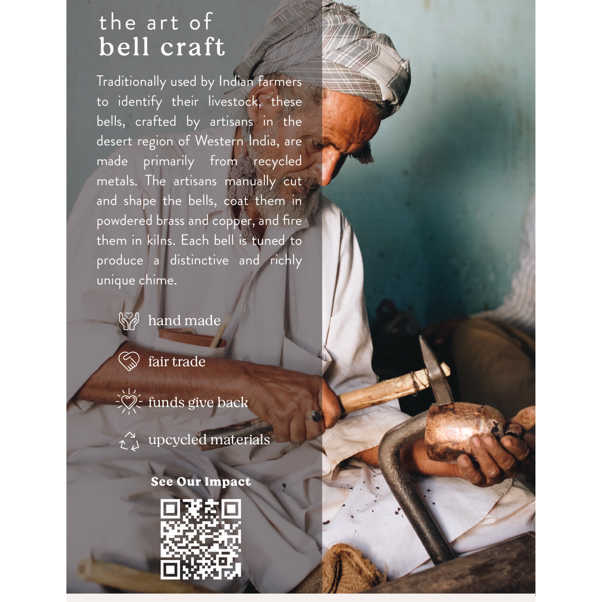 Our rustic cascading bell wind chime features handmade metal Indian cowbells. Bell making is a traditional artform passed down for generations in the desert Kutch region. This design is completed with a convenient, sturdy jute hanging loop. These bells can also work as hangings, door knob bells, ornaments & wreath decor.