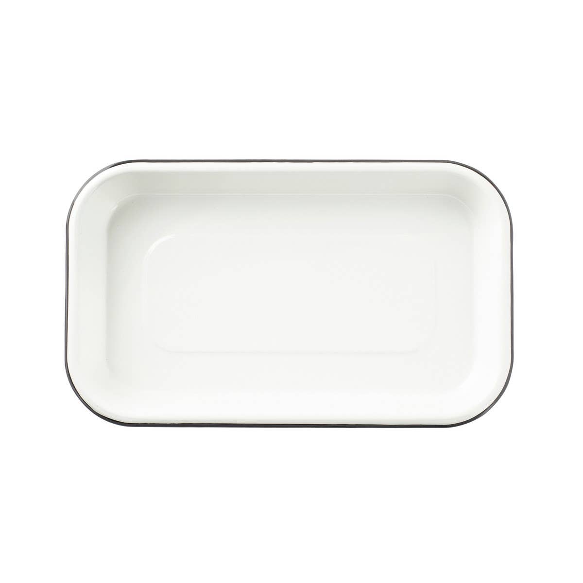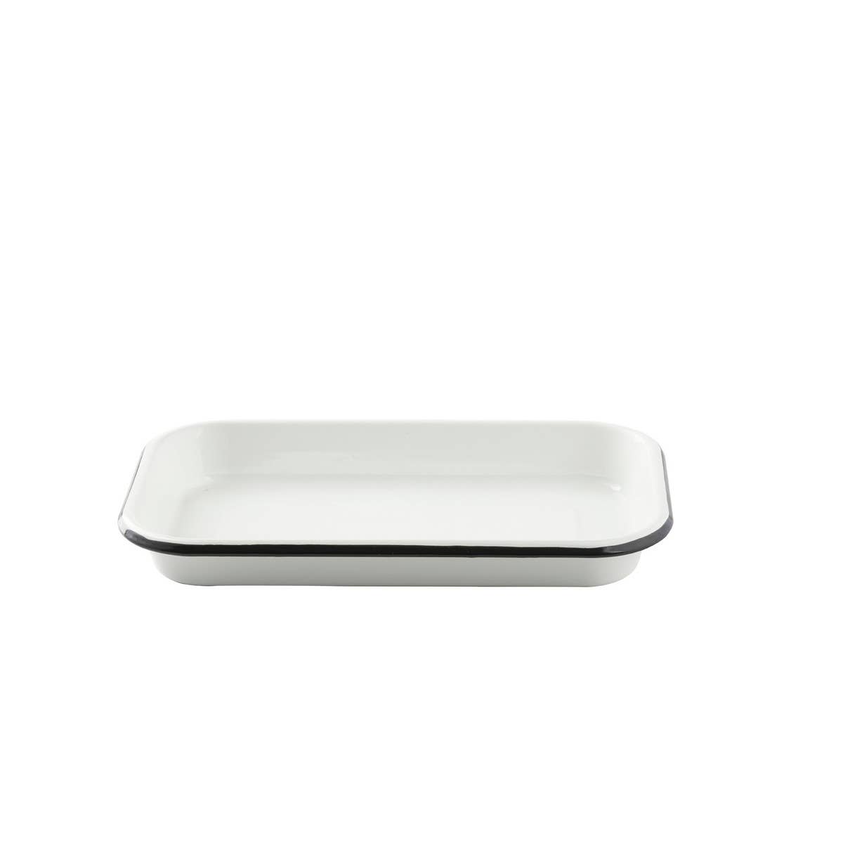 Add a touch of farm-to-table style with this small white sheet pan serving tray. Ideal as a plate, for side serving, small batch baking, display and more. Our enamelware sheet pans are constructed using the traditional method of vitreous porcelain enamel coated steel. Perfect for indoor or outdoor casual dining.