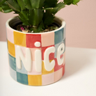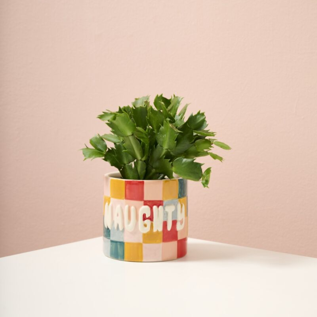 A fun & festive multi-color checkered design with "Nice" on one side and "Naughty" on the other. Add a drop-in peace lily or small poinsettia for a stunning holiday scene.