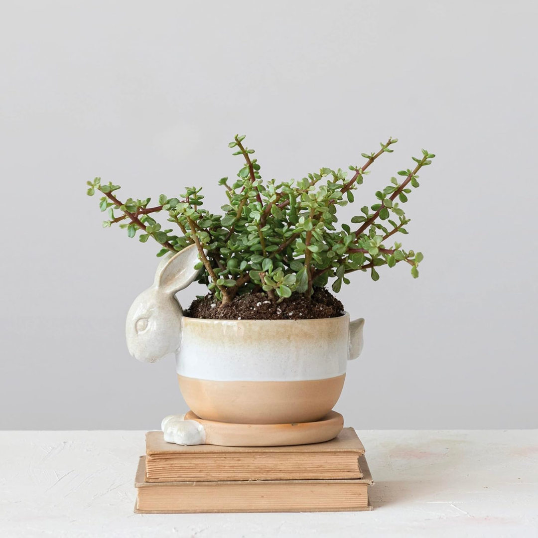 Showcase lovingly grown herbs and greenery inside pieces from this artfully crafted collection, or simply use as a stylish cover for low-maintenance faux flora. This charming stoneware planter and saucer set features a sculpted rabbit motif in a multicolor, naturally variating reactive glaze. Each one will vary.