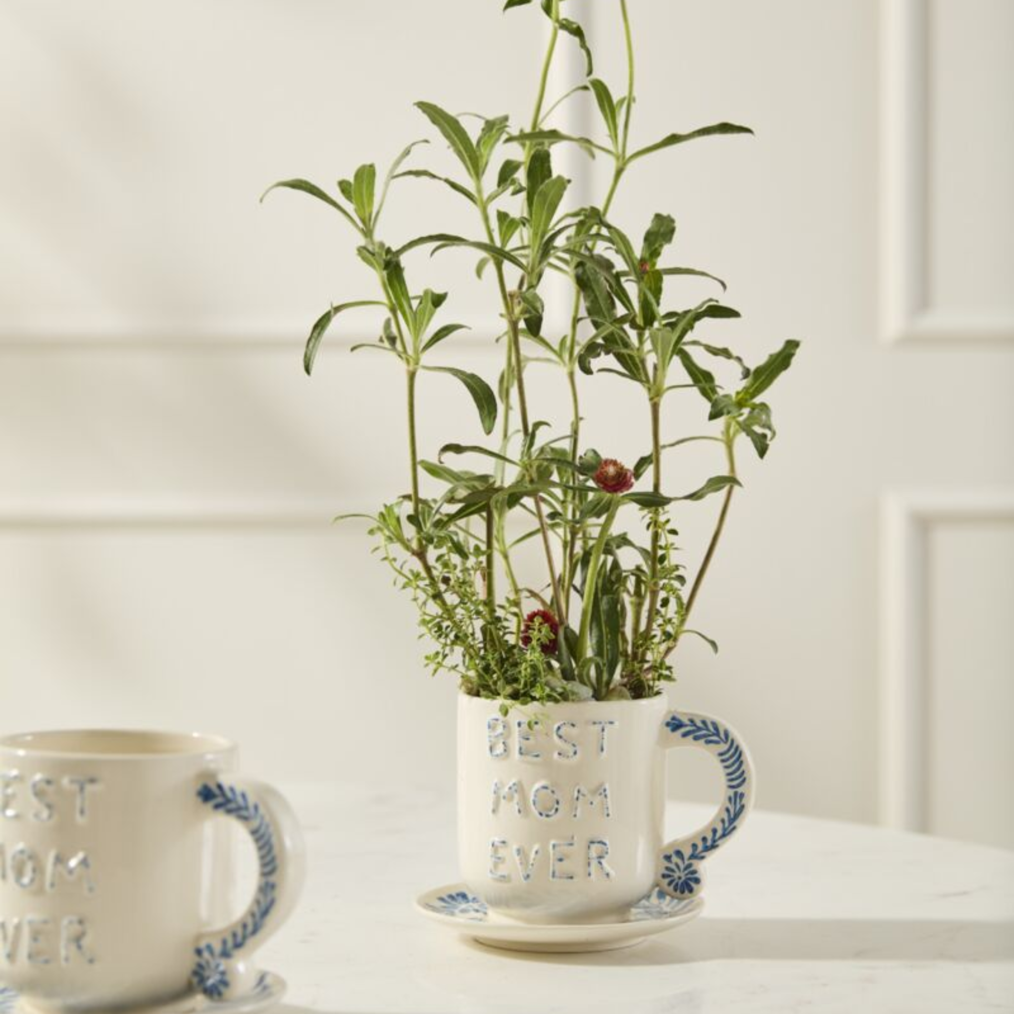 Give Mom an affirmation she can see every day with this adorable mug & saucer set featuring hand cut & applied lettering on the front that says "Best Mom Ever" with blue & white detailing on a white ground color. The mug handle & saucer are hand painted with a matching blue leaf pattern. Perfect for morning coffee or even a 3-inch drop-in plant, this mug makes a lovely Mother's Day or birthday gift.