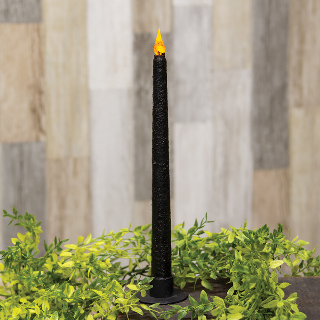 Made of wax with a rustic look and a lightly textured surface. The flame-shaped light has a flickering glow for added realism. Measures 10.75" tall with a 0.75" diameter. Requires 2 AAA Batteries (not included).