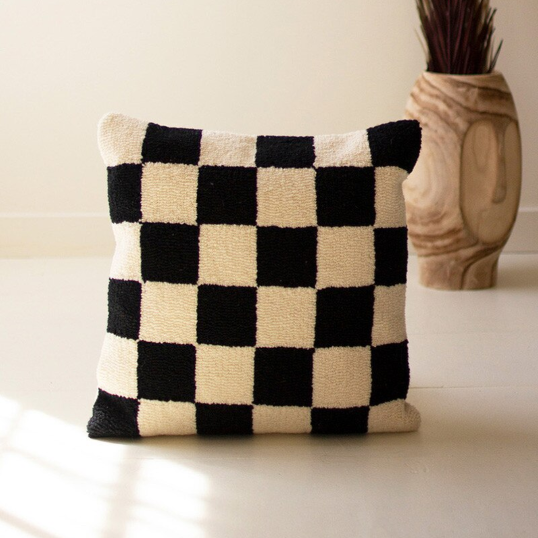 This black and white checkered pillow is hand-hooked, giving it a cozy, textured look & feel. Bring a pop of color to your space or a fun seasonal touch during fall!