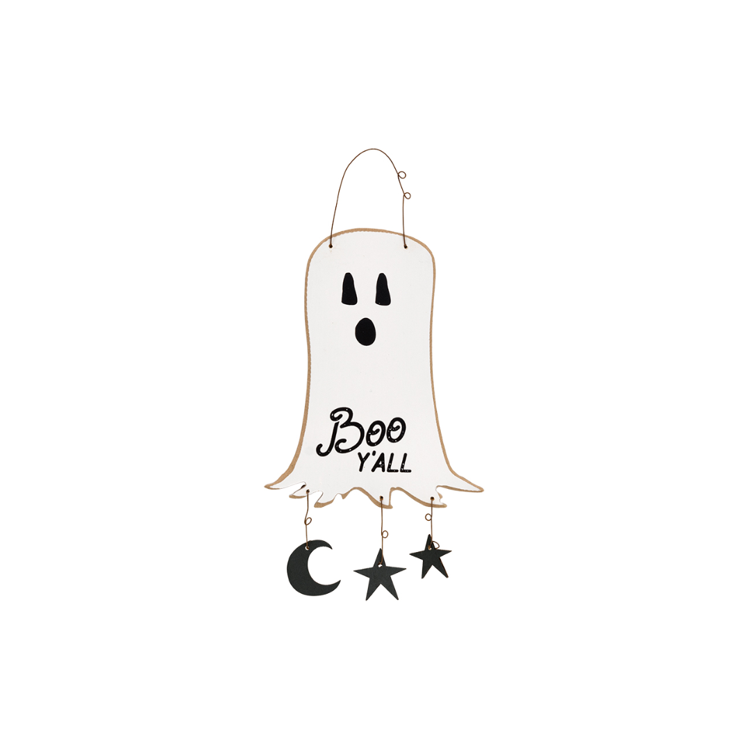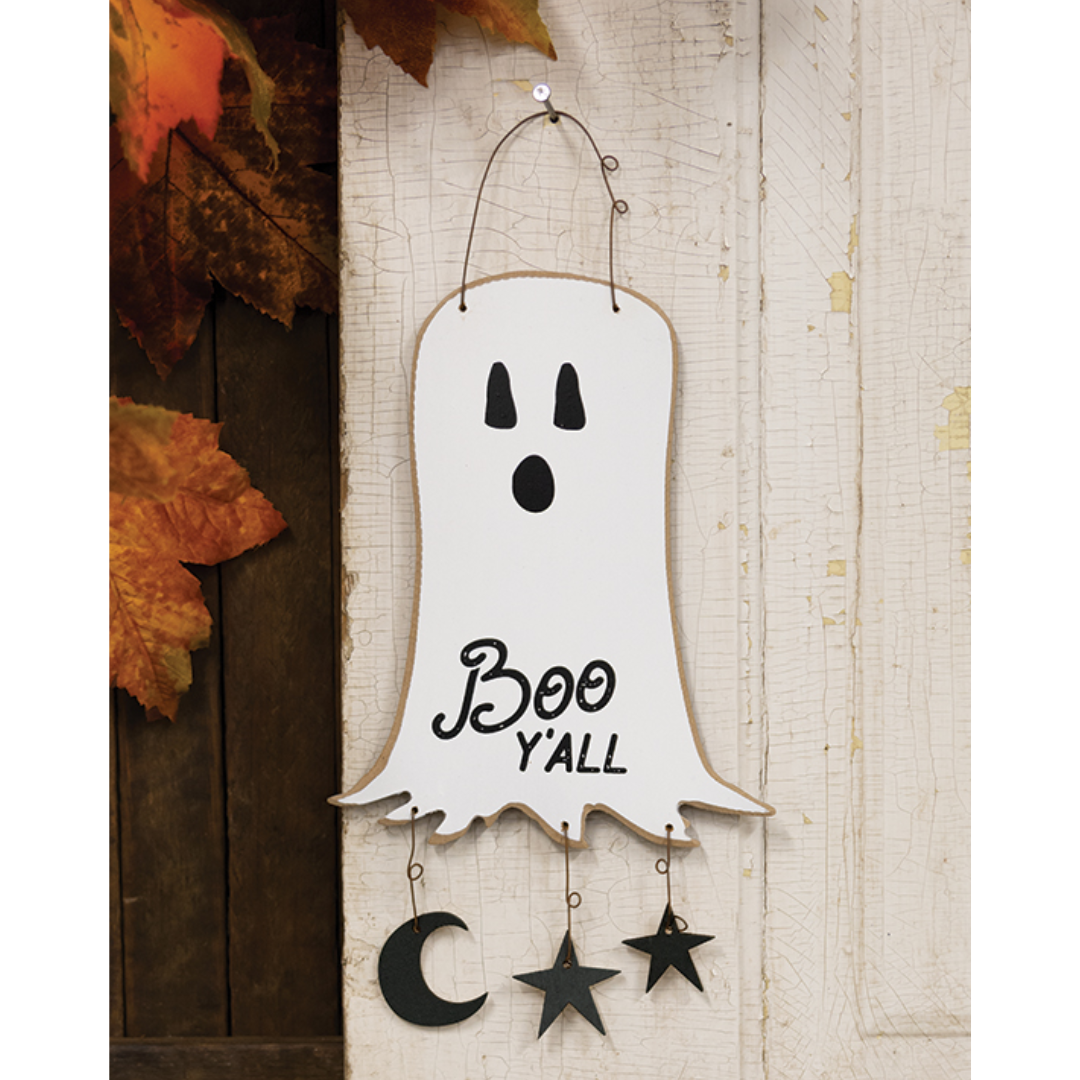 This spooky and fun ghost wood wall hanger reads, "Boo Y'all" and features dangling moon & star charms and rustic, curled wires for added whimsy. The edges of the ghost are heavily distressed for a worn, vintage appearance.
