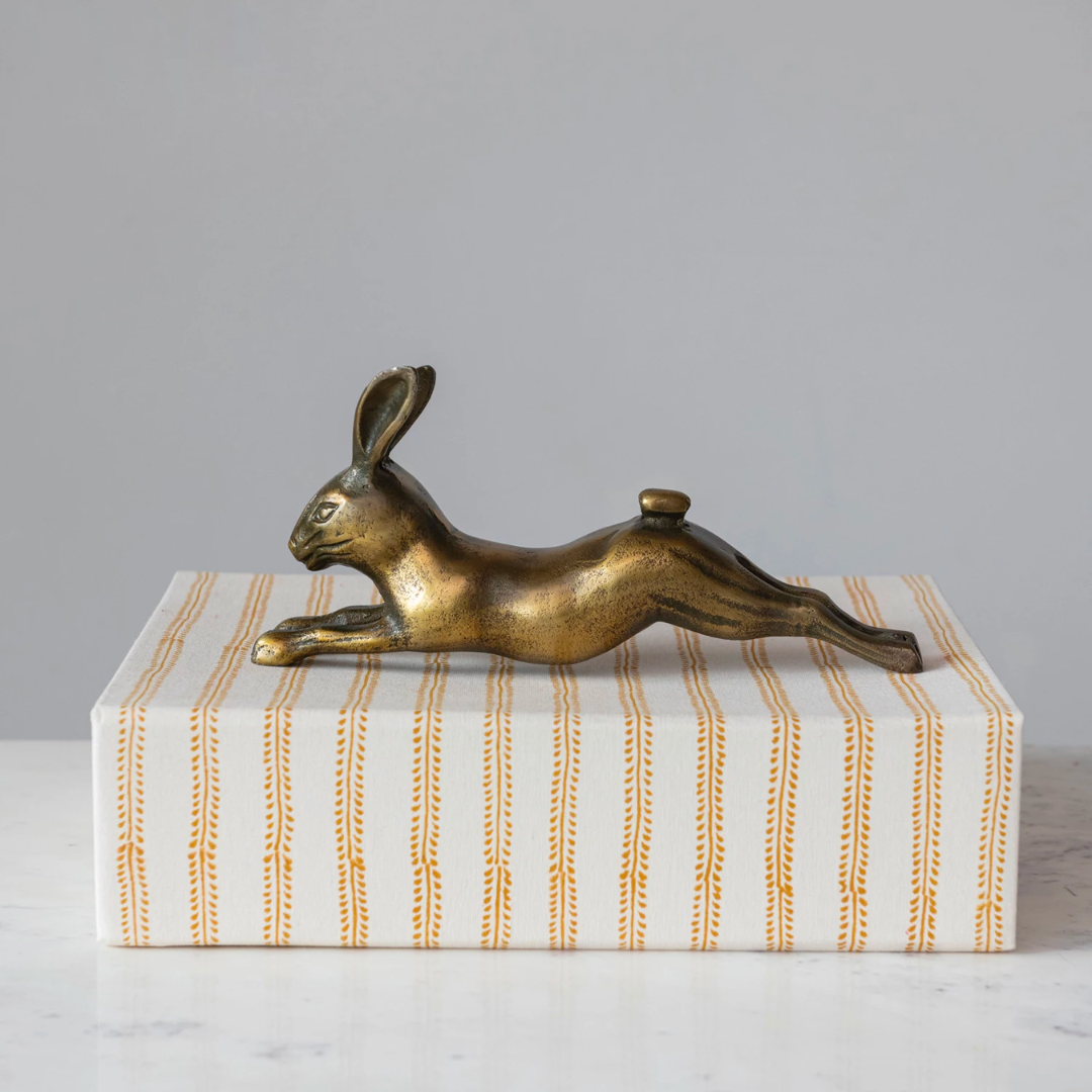 Cast aluminum rabbit in an antique brass finish.