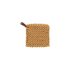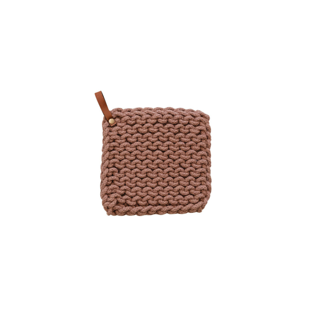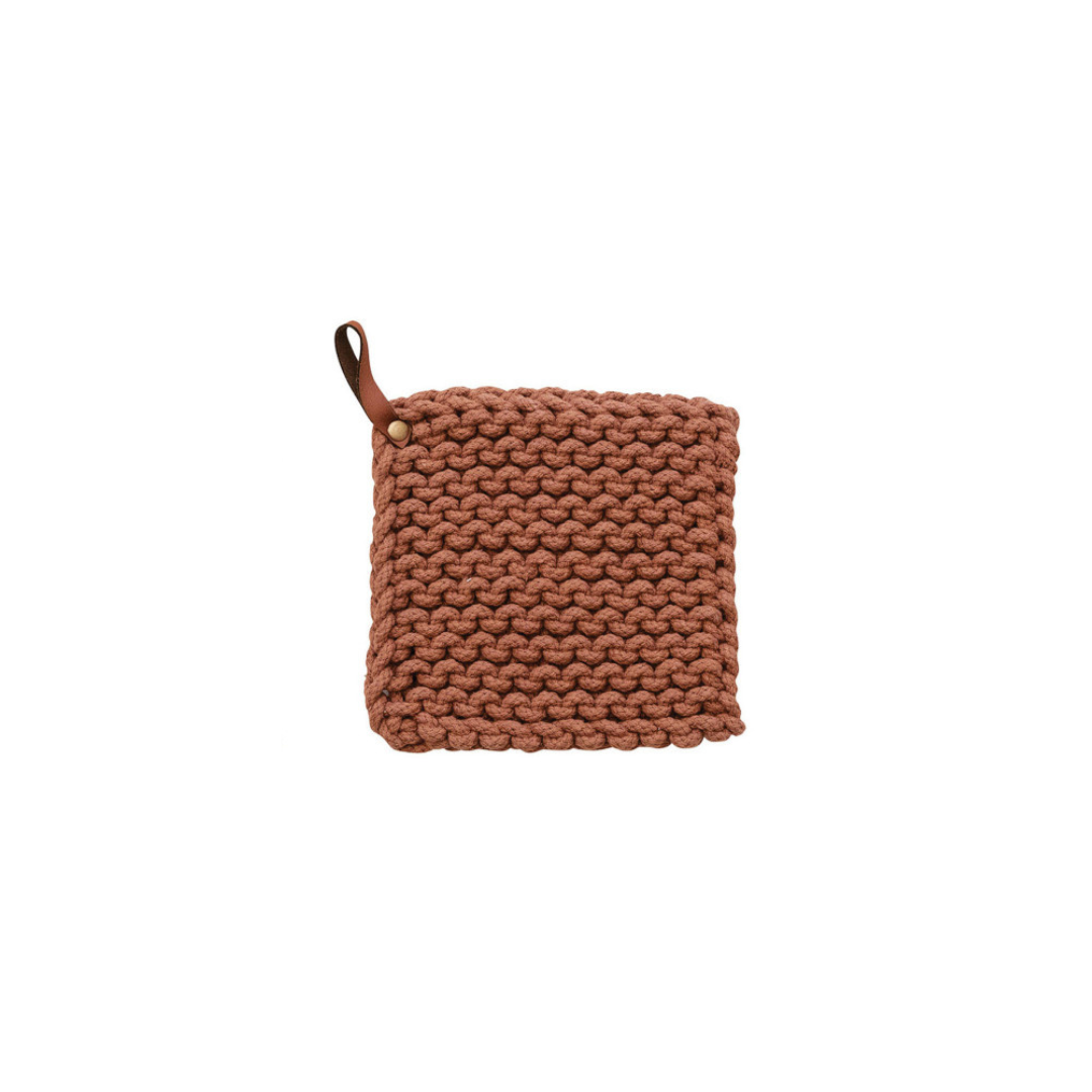 This multicolor square cotton crocheted pot holder with a leather loop is a cozy and rustic addition to the home or office kitchen. It features a square shape and a cotton crocheted design in neutral colors providing protection from hot pots and pans. The holder's leather loop allows easy storage and access.