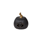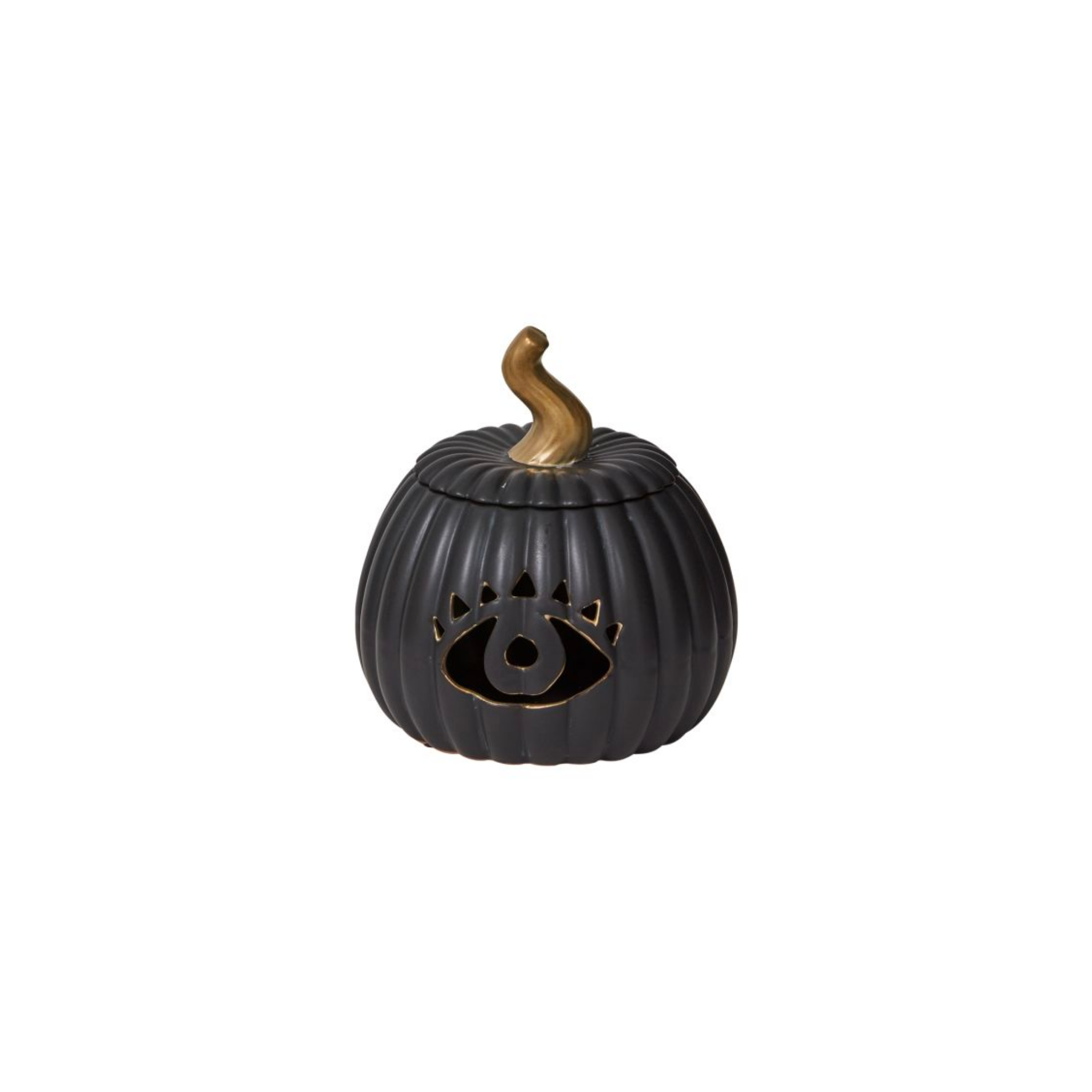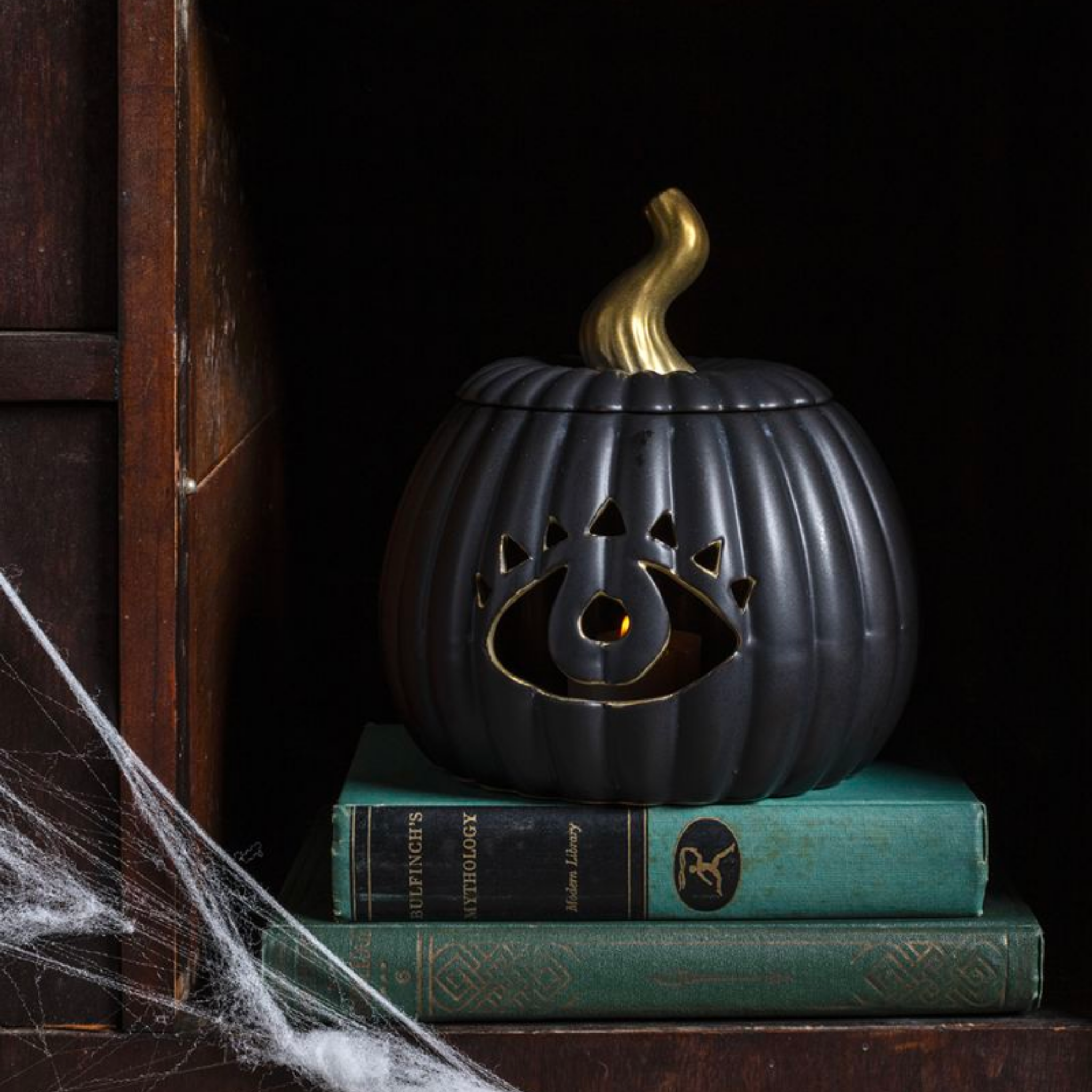 A sleek black pumpkin shaped ceramic lantern that glows warmly when lit with a small pillar or flameless candle inside. The lid lifts off by the gold stem handle and the base of the pumpkin has eye shaped cut outs rimmed in gold for light to glow from.