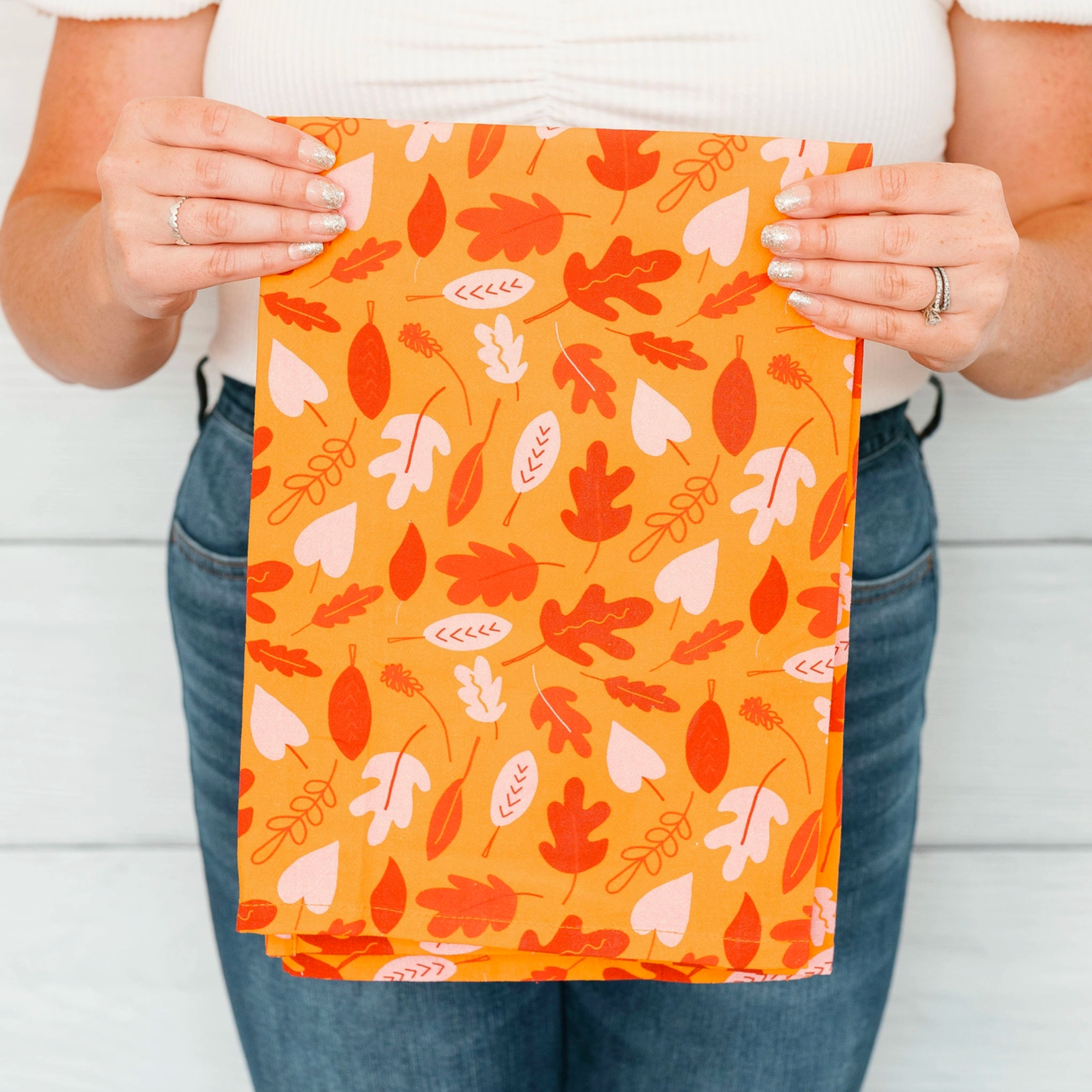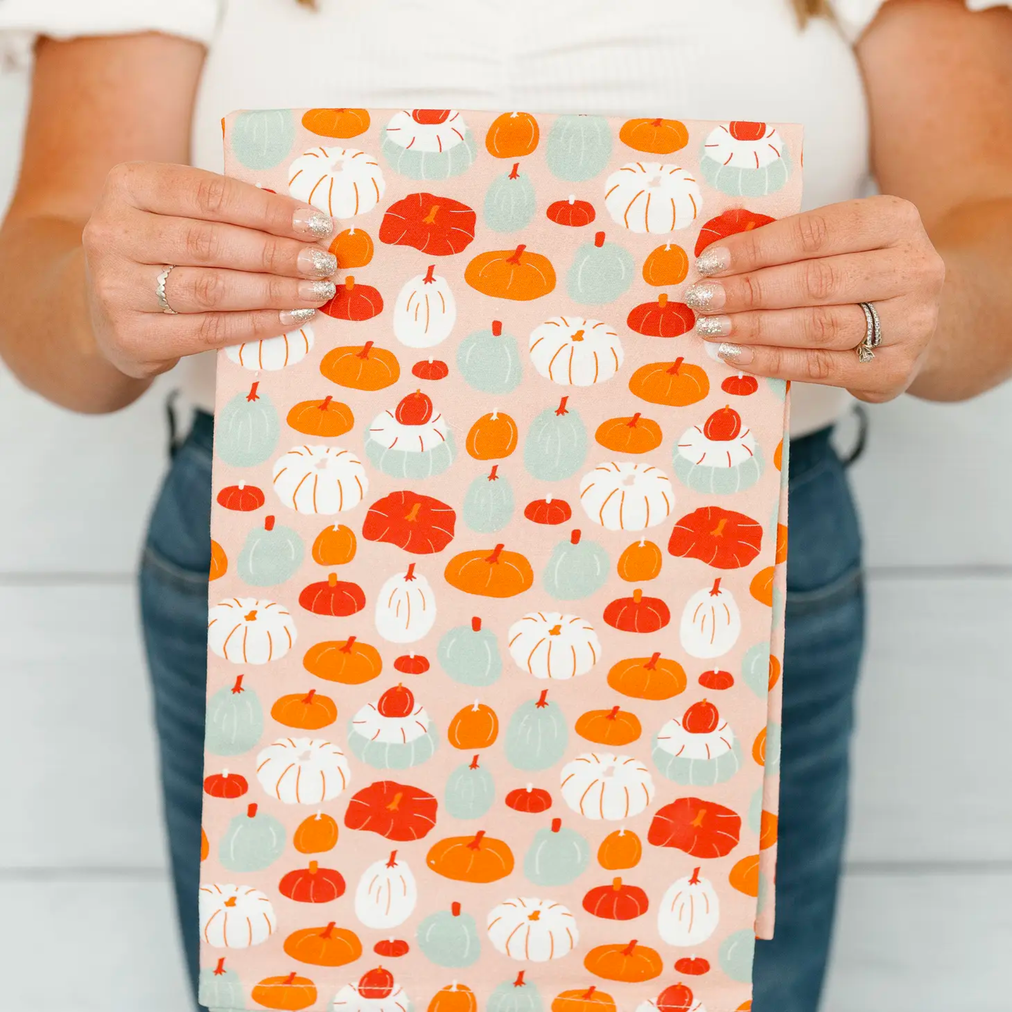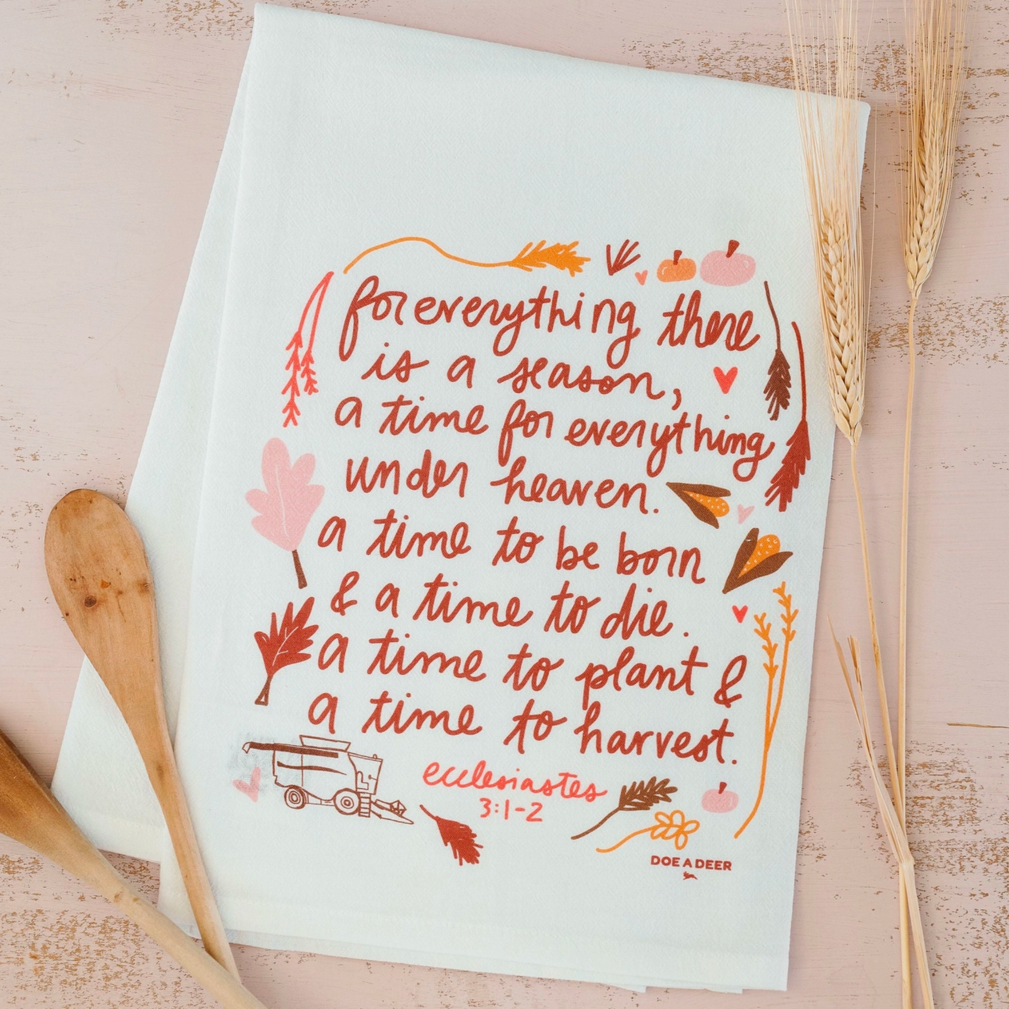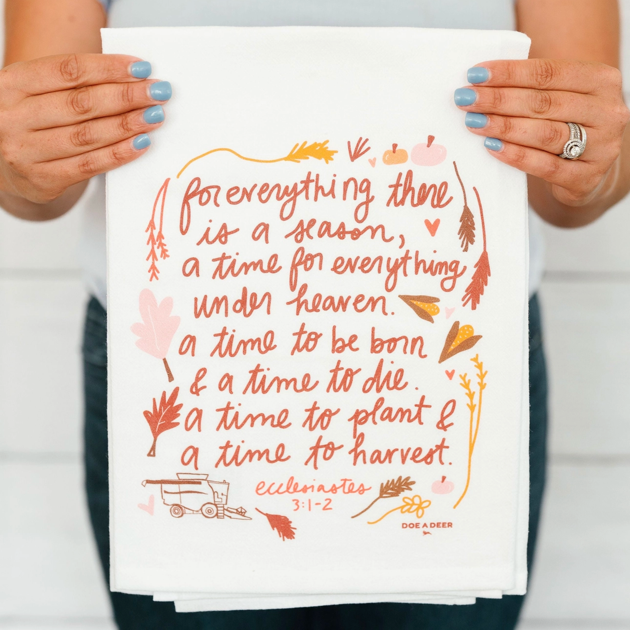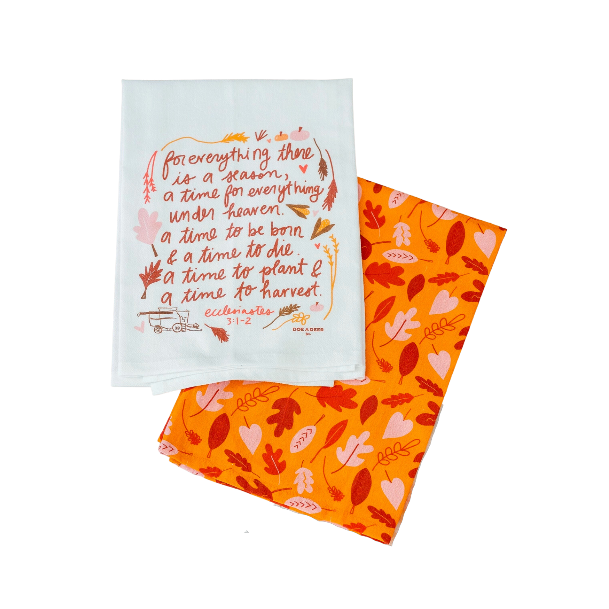 The cutest fall-inspired flour sack towels you've ever seen! Choose from our full pattern hand drawn pumpkins, our full pattern festive falling leaves towel, or our for everything there is a season scripture towel.