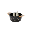A hauntingly delightful small candy bowl with little ghosts that decorate the inside. A dark blue starry sky pattern covers the outside of the ceramic bowl, and two handles allow for easy offering to guests.