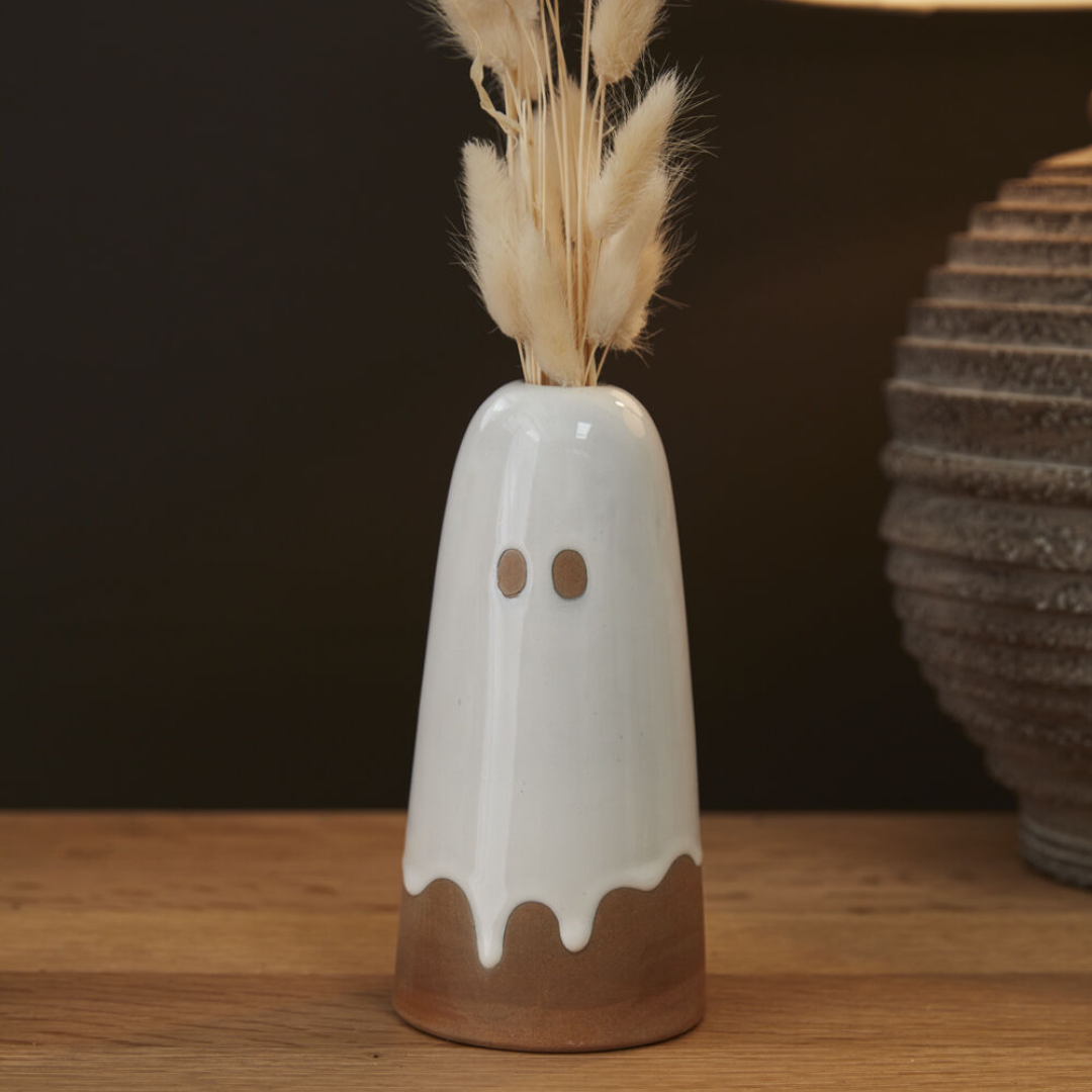 You’ve never seen a friendlier ghost than our ghosted budvase! This whimsical vase is made from brown clay, features glossy, ghost-like designs in a drippy white glaze with natural bisque accents. Perfect for a few stems and to add a touch of charm to your Halloween decor.