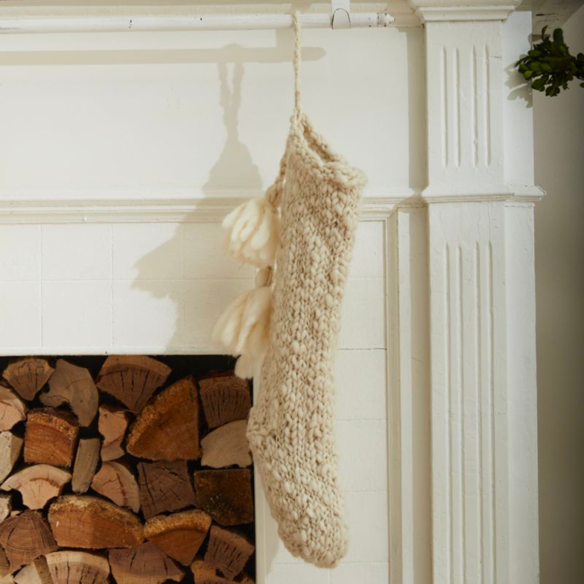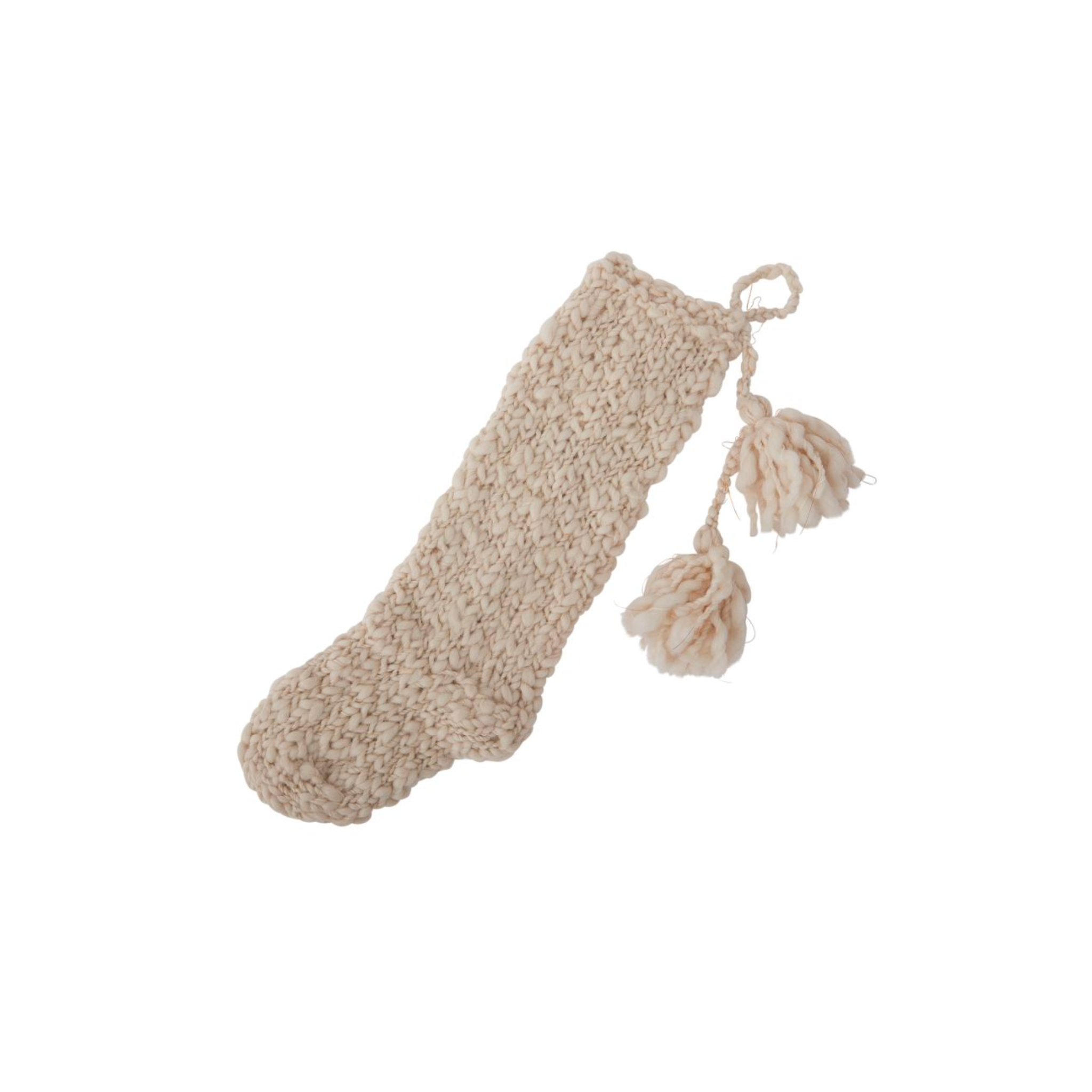 Keep the mantle cozy with the this sweater knit stocking with tassels and pompoms in holiday colors.
