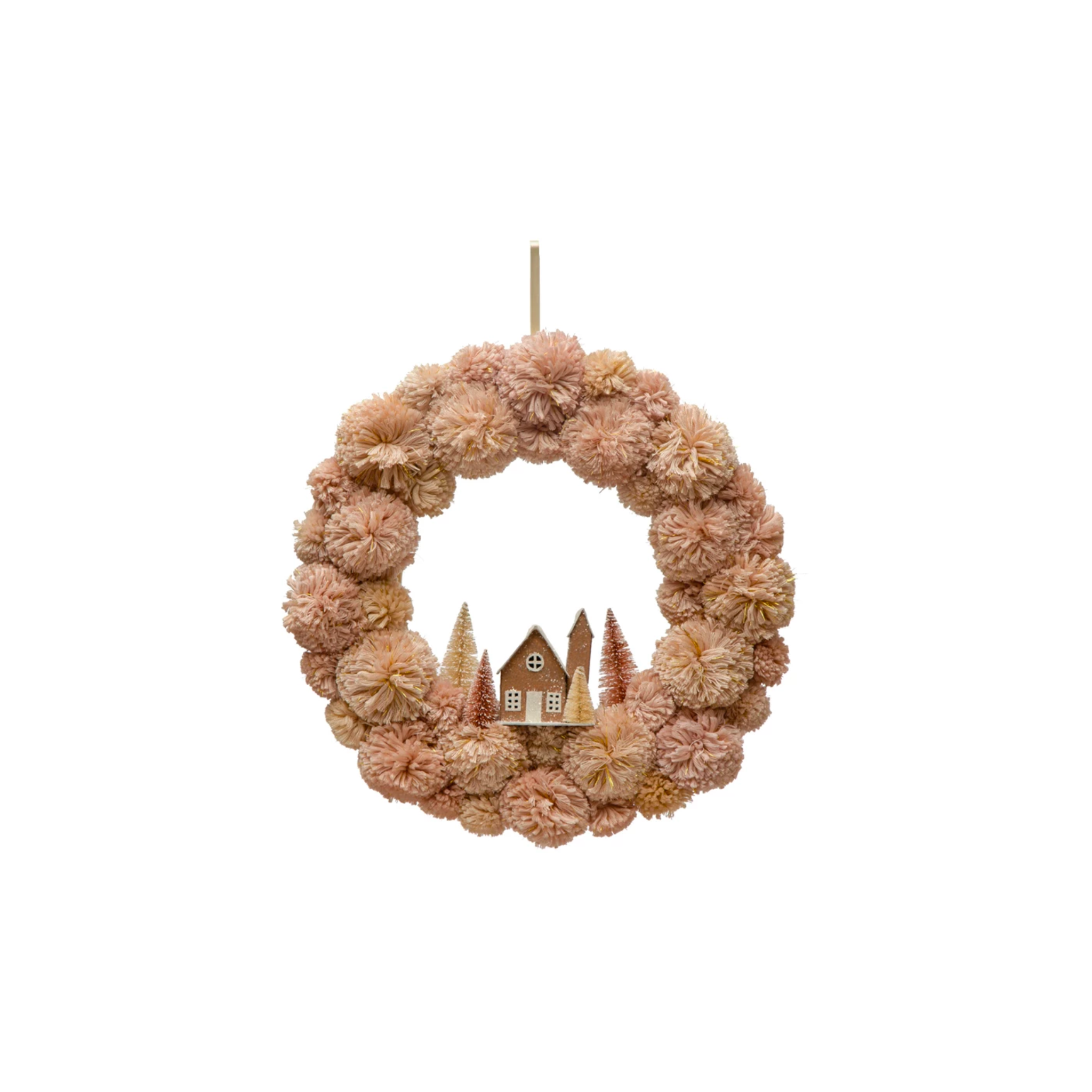 18" Round Pom Pom Wreath w/ Sisal Bottle Brush Trees & Paper House, Pink