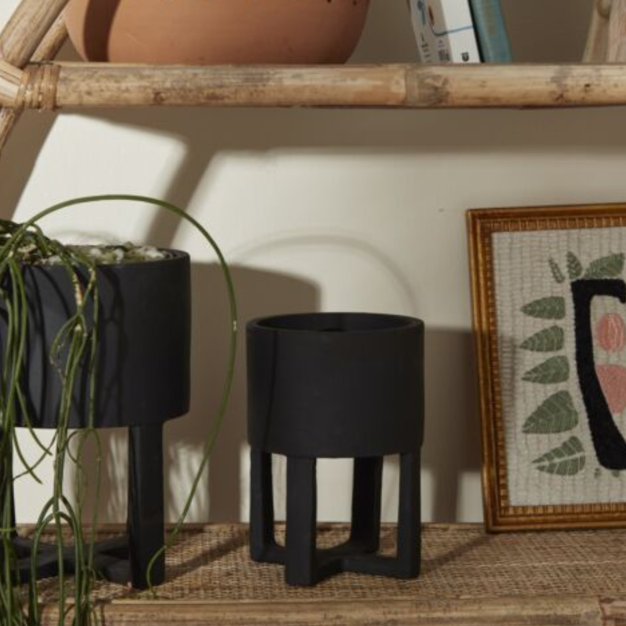 A unique elevated structure for plants adds height to tabletop decor. Featuring a connected, cross-legged base. Terracotta with a matte black finish, this piece offers a clean & modern yet handcrafted look.