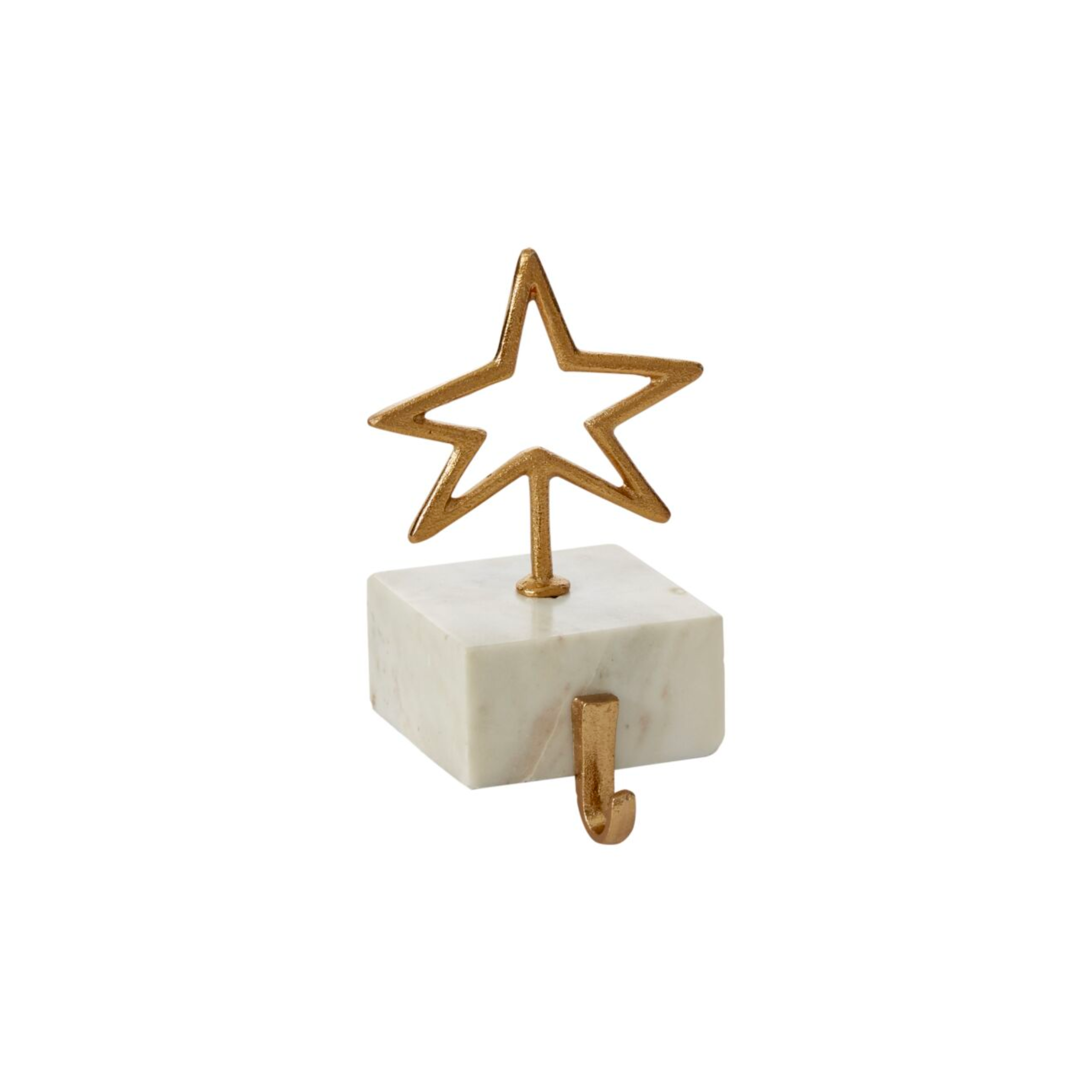 Enjoy the stunning beauty of bright gold cast aluminum & white marble with this sturdy stocking holder, featuring a gold star suspended on a marble base with a hook for stockings. The weighty base keeps goodies secure on the mantle.